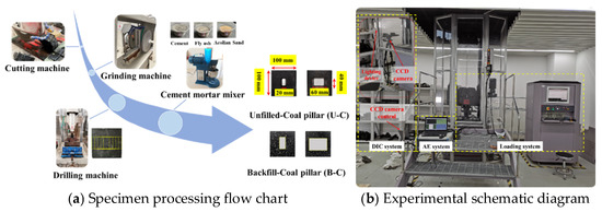 However, to more accurately reveal the failure process and mechanical response of roadway surrounding rock under actual stress conditions, physical model tests have gradually become an important research direction. In an infinite stratum, the existence of roadway can be analogous to a hole or cavity in underground rock formations. Therefore, studying the failure and crack evolution laws of rocks containing holes and cavities can effectively reflect the failure laws of roadway surrounding rock [8,9,10]. For example, Chang et al. [11] carried out true triaxial tests on limestone samples with circular holes to explore the spalling-rock burst failure mechanism of roadway surrounding rock in high-stress environments. Xin et al. [12,13] conducted physical shear failure tests on hard rock caverns using red sandstone samples, considering four key controlling factors affecting the shear failure behavior of caverns (i.e., cavern number, cross-sectional shape, cavern spacing, and backfill), and revealed the deformation law, failure mode, and instability mechanism of cavern surrounding rock under strong shear. Zhu et al. [14] performed coupled static–dynamic loading tests on diorite specimens under three different filling states (unfilled, single-filled, and double-filled), investigating the influence of filling on the mechanical response and fracture behavior of pre-stressed rock with double rectangular holes under dynamic loads. Lee et al. [15] studied the acoustic emission response characteristics during the formation of damaged zones around circular openings, and found that tensile failure occurred along the direction parallel to the maximum compressive stress axis with the increase in applied load. Zhu et al. [16] conducted uniaxial compression tests on plate-shaped marble specimens with prefabricated elliptical holes, exploring the influence of the aspect ratio and inclination angle of the ellipse on the mechanical properties of marble, and recorded and analyzed the deformation and fracture process of the specimens using digital image correlation (DIC) technology. Liu et al. [17] studied the deformation and failure characteristics and acoustic properties of sandstone with different roadway shapes under cyclic loading and unloading. Wu et al. [18] investigated the mechanical properties and fracture characteristics of red sandstone specimens with five hole shapes under uniaxial loading. Gong et al. [19] studied the spalling process of deep-buried rectangular tunnel excavation under triaxial stress, performed physical simulation tests of rectangular tunnels using a true triaxial test system, and recorded and monitored in real-time the damage process of the rectangular tunnel sidewalls with a high-speed camera. Wu et al. [20] systematically studied the influence of hole shape on the mechanical properties and fracture characteristics of rocks under uniaxial compression, finding that the presence of holes significantly impairs the mechanical properties of rocks. Zhou et al. [21] conducted uniaxial compression tests on specimens with single and double rectangular holes, revealing that the mechanical properties of specimens with double rectangular holes deteriorate more severely than those with a single rectangular hole. Despite numerous studies focusing on the failure mechanism and mechanical response of surrounding rock structures with holes and cavities, research on the mechanical bearing characteristics and failure laws of composites composed of coal pillars with rectangular roadways and backfill is relatively scarce.