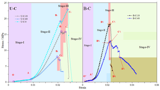 Stress–strain curves can effectively reflect the mechanical response of U-C and B-C specimens subjected to uniaxial compression. Figure 2 presents the stress–strain relationships of the two groups of specimens (U-C and B-C); both U-C and B-C specimens exhibit four typical stages: pore compaction stage, elastic stage, yield stage, and post-peak residual stage. Notably, compared with the U-C group, the B-C group has an evident post-peak residual stage.