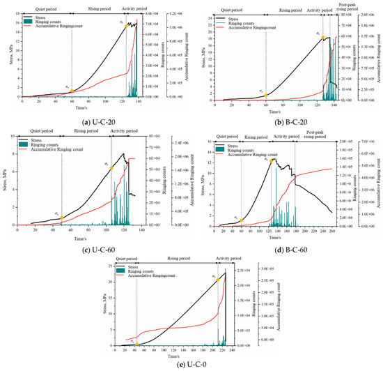 Quiet period: This stage corresponds to the compaction stage of the stress–strain curve, with the stress at the end of the stage being approximately 1.0 MPa. The existing micro-fractures of the specimens are compacted, but their activity amplitude does not exceed the AE threshold, resulting in low-level fluctuations overall and steady growth of the ringing count curve.