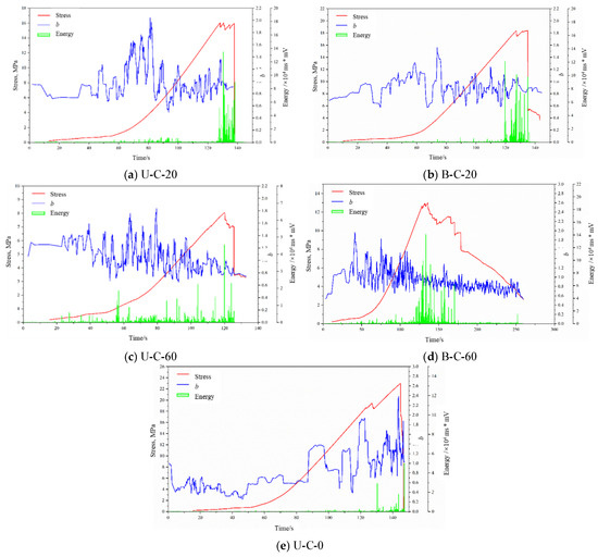 In this study, the reference sampling window is set to 100 AE events, consistent with Zhang et al. [25], who demonstrated that this window balances temporal resolution and stability—avoiding excessive fluctuations from smaller windows or delayed response from larger ones. To reduce the interference of noise data from previous and subsequent samples on the b-value results, the sliding window is set to 10 AE events, and an overlap rate of 90% between sampling windows is adopted to improve the temporal resolution of the b-value [26]. Considering the correlation between the b-value and energy, the comparison between AE energy and b-value characteristics is plotted in Figure 4.