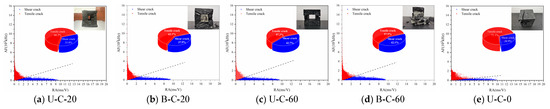 From the proportion of crack distribution in Figure 5, it can be found that the proportion of tensile cracks in both U-C and B-C specimens identified by AE parameters is greater than that of shear cracks under uniaxial compression. The tensile crack ratio of U-C-0 is 71.1%, occupying a dominant position. With the increase in excavation–backfill width, the proportion of tensile cracks gradually decreases, while the proportion of shear cracks gradually increases. Especially for U-C-60, the proportion of shear cracks is 42.7%, and the shear–tensile ratio is 0.74. The proportion of tensile cracks in the B-C group is generally lower and shows a slow downward trend, decreasing from 66.7% for B-C-20 to 58.3% for B-C-60. In summary, with the increase in excavation–backfill width, the failure mode of specimen transitions from tensile failure to tensile–shear failure, and the crack evolution characteristics of the U-C group are similar to those of the B-C group.