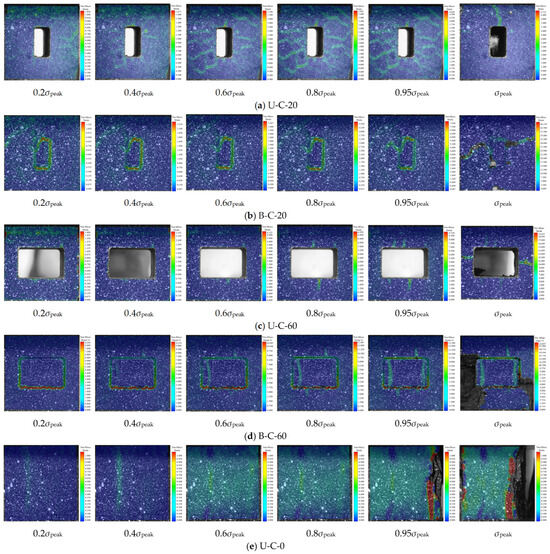 As shown in Figure 6, for U-C-0, at the initial loading stage (0.2σpeak), micro-cracks along the bedding direction appear on the specimen surface under axial loading. With the increase in axial loading (0.4σpeak–0.95σpeak), crack evolution on the left side of the specimen is obvious, and significant splitting failure occurs on the right side. When the load reaches the peak (σpeak), extensive splitting occurs along the bedding plane on the right side of the specimen. When the excavation width is 20 mm, at the initial loading stage (0.2σpeak), the specimen exhibits compressive deformation at the top under axial loading without obvious damage. With the increase in axial loading (0.4σpeak–0.95σpeak), transverse cracks appear at the lateral coal wall positions of the specimen, and their number and intensity gradually increase. When the load reaches the peak (σpeak), large longitudinal macrocracks appear at the top coal wall of the specimen. When the excavation width is 60 mm, at the initial stage (0.2σpeak), vertical cracks appear on the upper and lower surfaces of the rectangular roadway. With the increase in loading intensity (0.4σpeak–0.95σpeak), the number of vertical cracks on the upper and lower coal walls increases. When the peak strength (σpeak) is reached, transverse cracks appear on both sides of the coal wall accompanied by partial coal spalling.