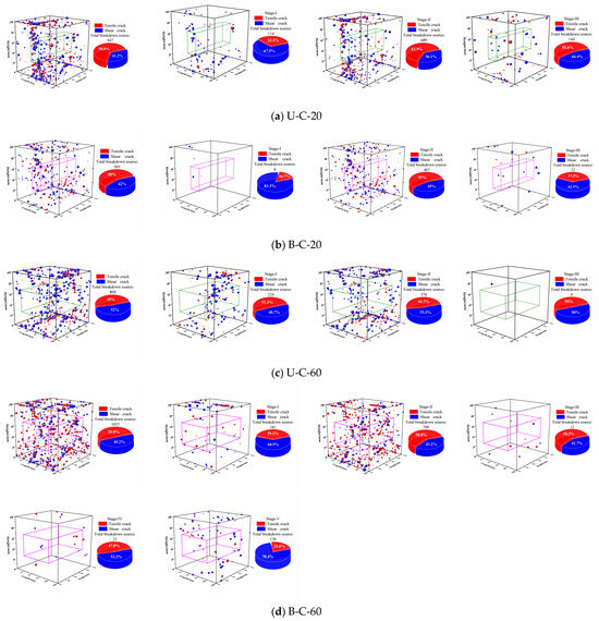 Digital image correlation provides the surface strain field, while AE signals reveal the initiation and coalescence of internal micro-cracks. The RA-AF method distinguishes crack types by calculating the ratio of RA to AF for each AE signal. However, a single AE source location is usually inverted from multiple AE signals, and redundant data may lead to deviations in judgment results. Therefore, it is necessary to confirm the fracture type of the AE source location by comparing the fracture types inverted from different AE signals. Figure 7 shows the distribution of AE fracture sources of U-C and B-C specimens [29]. In Figure 7, blue and red dots represent shear and tensile AE fracture sources, respectively, and the size of the dots indicates the magnitude of the fracture source. The statistics of AE fracture sources at each stage are presented in Table 5.