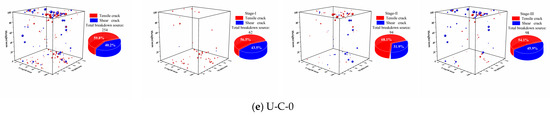 As can be seen from Figure 7, fracture sources are generated mainly in stage II, where micro-cracks nucleate and evolve into macro-cracks. For the U-C-0 specimen (Figure 7e), AE fracture sources are mainly concentrated in the middle bedding plane under uniaxial compression. The number of shear and tensile fracture sources is nearly equal, especially in stage II, with a ratio close to 1, indicating that shear and tensile cracks are almost equivalent and the fracture is relatively balanced. This is because the bedding plane undergoes tensile failure followed by shear slip under compressive stress. When the excavation–backfill width is 20 mm (Figure 7a), the number of tensile fracture sources surges in stage II, accounting for 54.1%, indicating that tensile cracks dominate the specimen, with a significant gap between the number of shear and tensile fracture sources. For the U-C-60 specimen (Figure 7c), AE fracture sources are relatively scattered under uniaxial compression, suggesting the existence of multiple crack propagation paths. The proportion of shear fracture sources is slightly higher than that of tensile fracture sources. With the excavation–backfill width increasing from 0 mm to 60 mm, the failure mode of the specimens gradually transitions from tensile failure to shear failure.