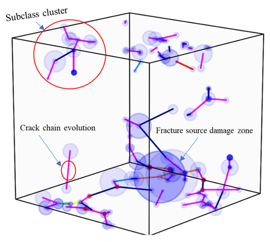 The analysis of AE fracture sources mainly reflects the shear–tensile ratio of failure mode, but it cannot form a macro-failure surface. It judges the failure interface and relative failure mode, and cannot intuitively reflect the rock failure path and crack type. Clustering, a commonly used machine learning method, is usually employed to invert crack failure types. The Single-linkage Cluster (SLC) method [30,31] forms crack evolution links by connecting the closest fracture sources and divides the crack chain evolution links into different sub-clusters based on similarity characteristics, consistent with the crack propagation in local areas of rock [32,33]. In Figure 8, the line segments represent the crack evolution links between different fracture sources, the blue circles indicate the nucleation energy of fracture sources, and different line colors represent the relative average energy of crack evolution.