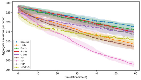 Simulations are conducted for governance scenarios defined by binary combinations of . The main analysis focuses on a pre-specified subset of nine scenarios (baseline, single-instrument cases, key pairs, and the full bundle) reported in the Results section. As a robustness check, we additionally simulate the full factorial set (16 scenarios).