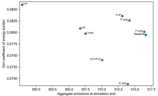 where denotes the realised energy use after adoption and (if applicable) enforcement adjustments. We report the mean burden, burden dispersion, burden inequality (Gini coefficient), and the share of households whose burden exceeds an affordability threshold (Table A2 and Table A3). Following the fuel poverty/energy burden literature, we operationalise affordability stress using the “10% rule” as a parsimonious benchmark: households with energy expenditures above 10% of income are classified as overburdened [68,69].