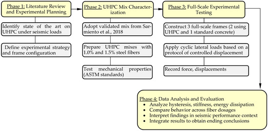 Based on the objectives outlined in the introduction, this section presents the experimental methodology designed to evaluate the seismic performance of full-scale UHPC frames. The methodology includes the definition of specimen geometry, material properties, fabrication process, instrumentation, and loading protocol. These aspects were selected to ensure that the experimental conditions reflect realistic structural behavior and comply with applicable code-based design criteria. Figure 1 presents the methodology used in this study, which includes four different phases: