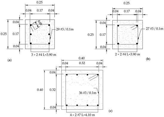 UHPC frames reinforced with steel fibers (Figure 3) were designed to assess their structural performance under pseudostatic in-plane cyclic loading. The geometry and reinforcement details of the frames are shown in Figure 4. The main dimensions include a total frame height of 3.15 m, a foundation beam length of 3.75 m, and a span between columns of 2.50 m. Cross-sectional dimensions are 0.25 × 0.25 m for columns (Figure 4a), 0.25 × 0.25 m for beams (Figure 4b), and 0.40 × 0.40 m for foundation beams (Figure 4c). Frame dimensions were selected based on theoretical and practical design considerations, supported by previous research such as Sarmiento et al. [2]. These cross-sectional dimensions correspond to the minimum full-size sections permitted by the Colombian Seismic Design Code for intermediate seismic hazard zones. Specifically, the code requires that the smallest dimension of a reinforced concrete structural member must not be less than 250 mm. In addition, the longitudinal reinforcement ratio in the columns was set at 1%, in accordance with the minimum required by the same design code. As such, the frame specimens reflect realistic, full-scale construction and were not scaled-down laboratory models. In addition, these proportions are representative of typical structural frames and allow for the observation and quantification of critical seismic performance phenomena, including plastic hinge development, global failure mechanisms, hysteretic behavior, and energy dissipation.