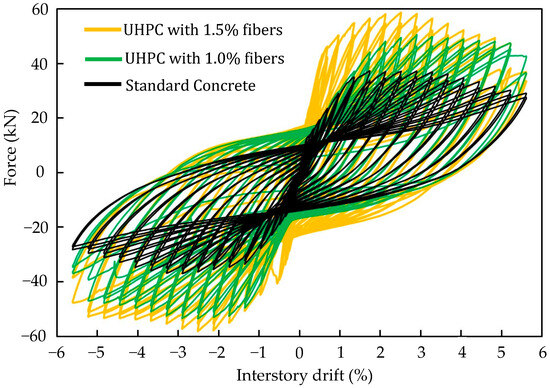 Based on the experimental results (Hysteretic load–displacement response) the ductility capacity, defined as the ratio between the ultimate drift and the yield drift, showed values of approximately 3.4 for standard reinforced concrete frame, 4.3 for the UHPC frame with 1.0% steel fibers, and 6.1 for the UHPC frame with 1.5% fibers. These results confirm that all frames exhibited moderate to high ductility, with a progressive improvement as fiber content increased.