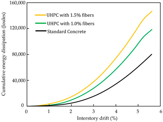 - The energy dissipation capacity of the frames increased with fiber content. The UHPC frame with 1.5% fibers dissipated a total of 146,000 J, followed by the 1.0% UHPC frame with 118,000 J, and the conventional concrete frame with 80,000 J. These results suggest that higher fiber content contributes to improved hysteretic energy dissipation in UHPC frames.