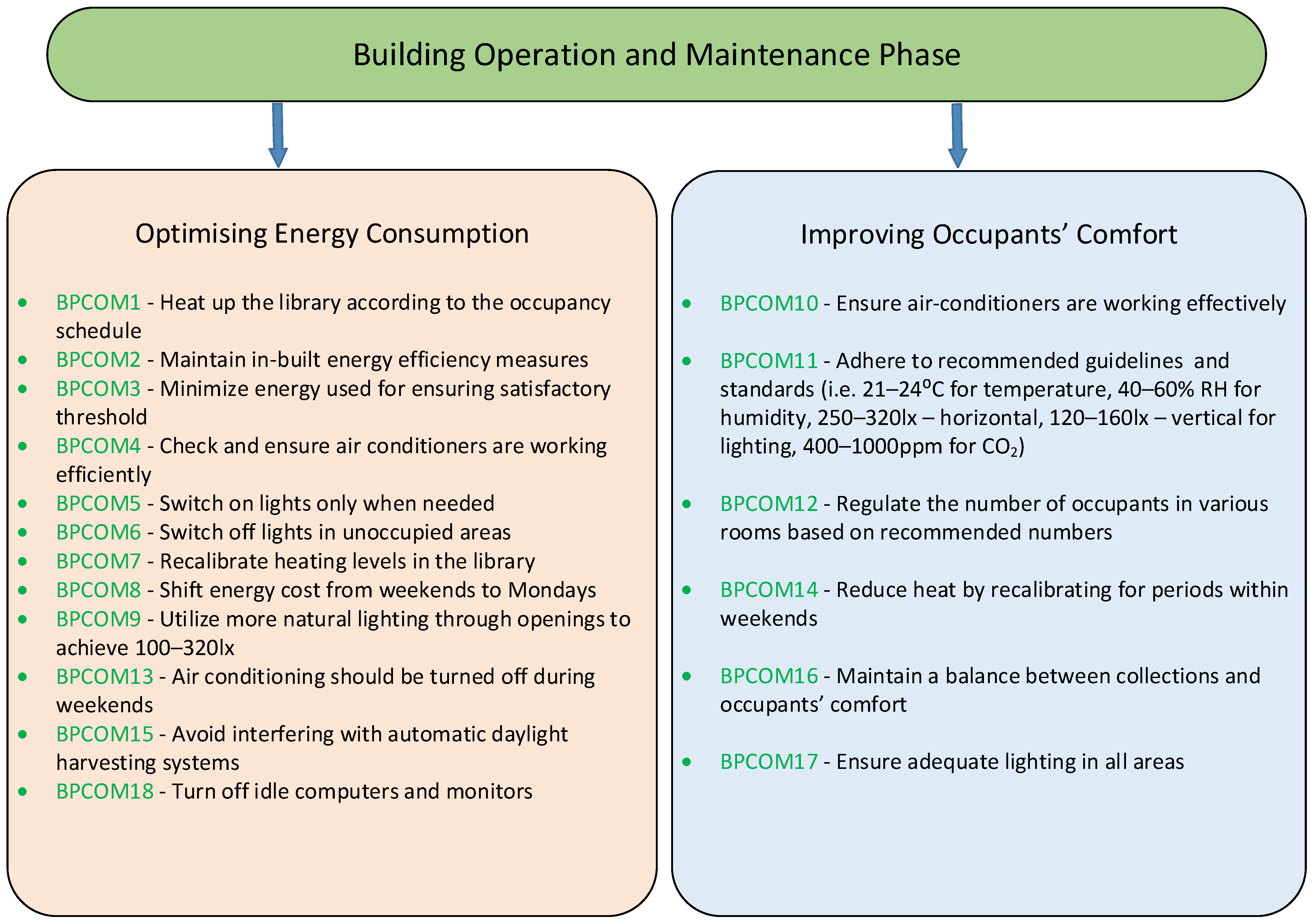 | BPCOM14 | HVAC system should be recalibrated to the specific heat needs and comfort of the occupants based on the season (i.e., winter and summer). The temperature in winter should be in the range of 20–25 °C, and in summer it should be in the range of 23–26 °C. |
