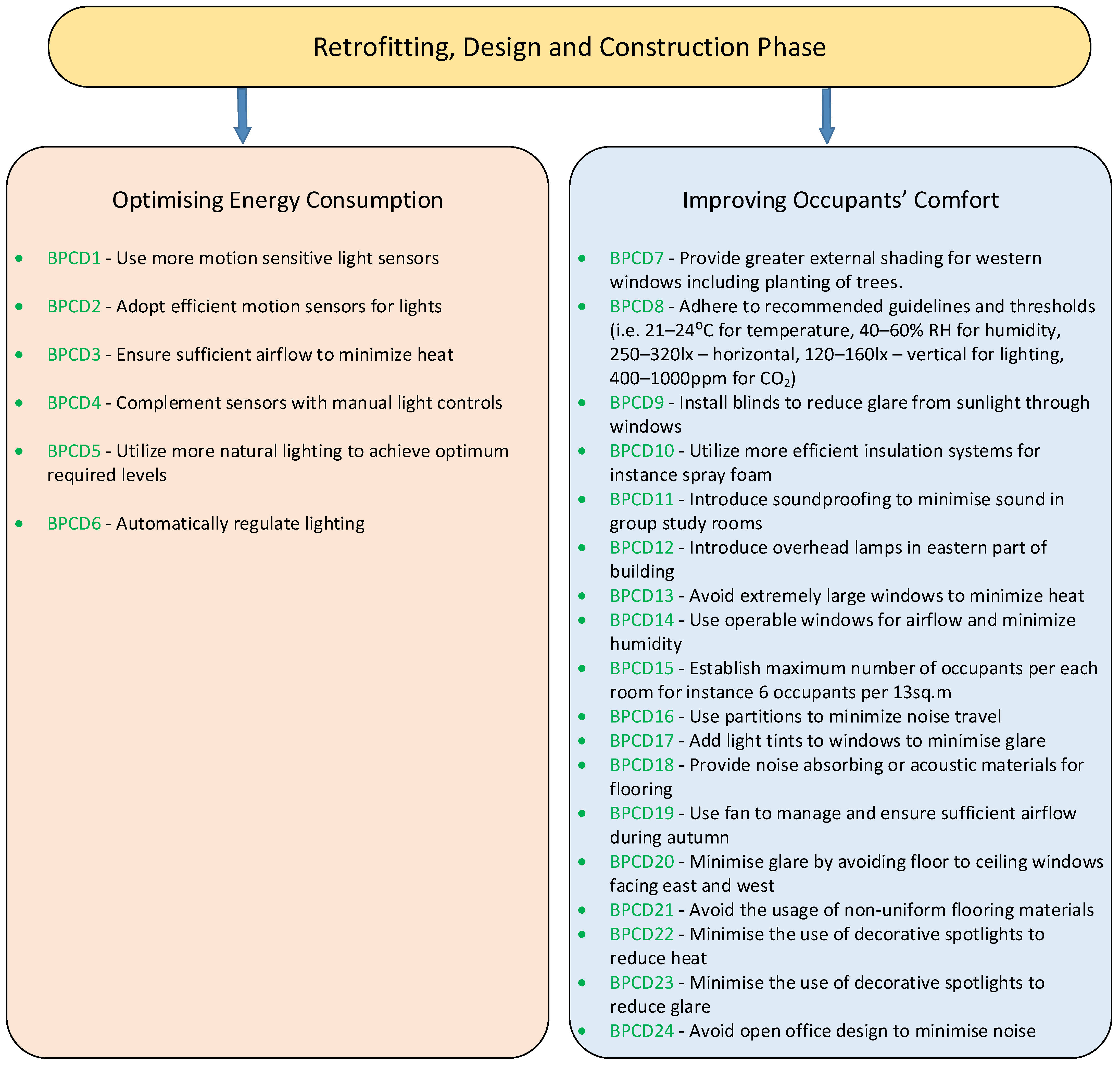 | BPCD2 | Adopt efficient motion sensors for lights to determine where there is occupancy, so that lights are automatically switched on. |