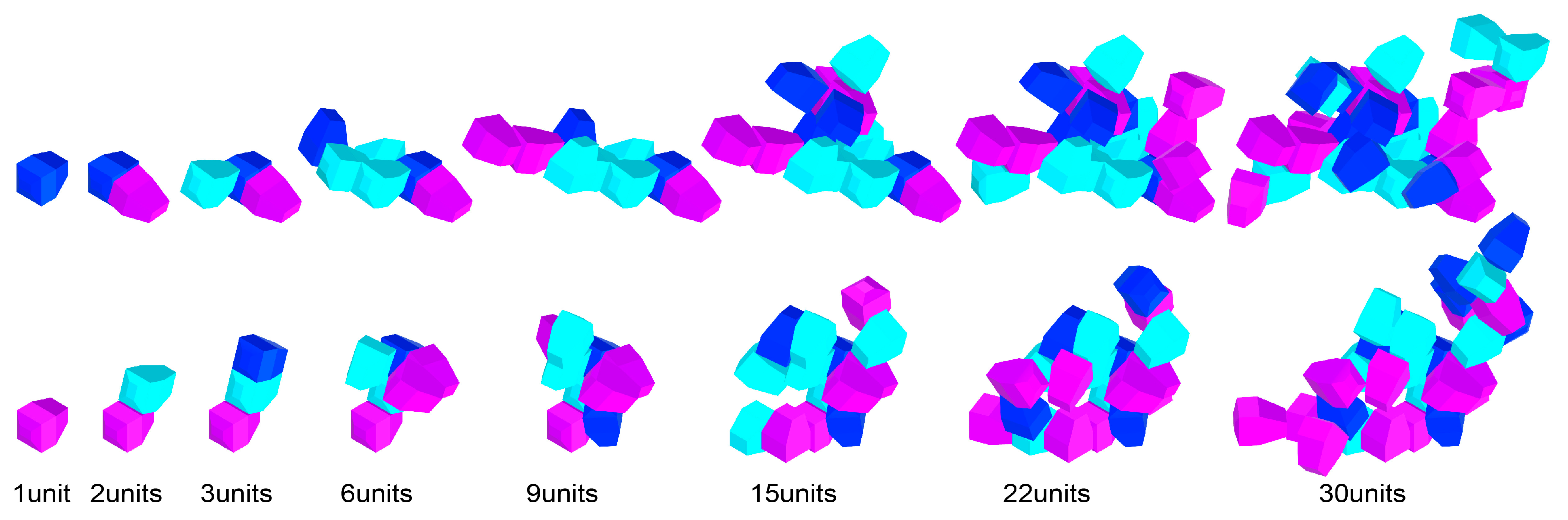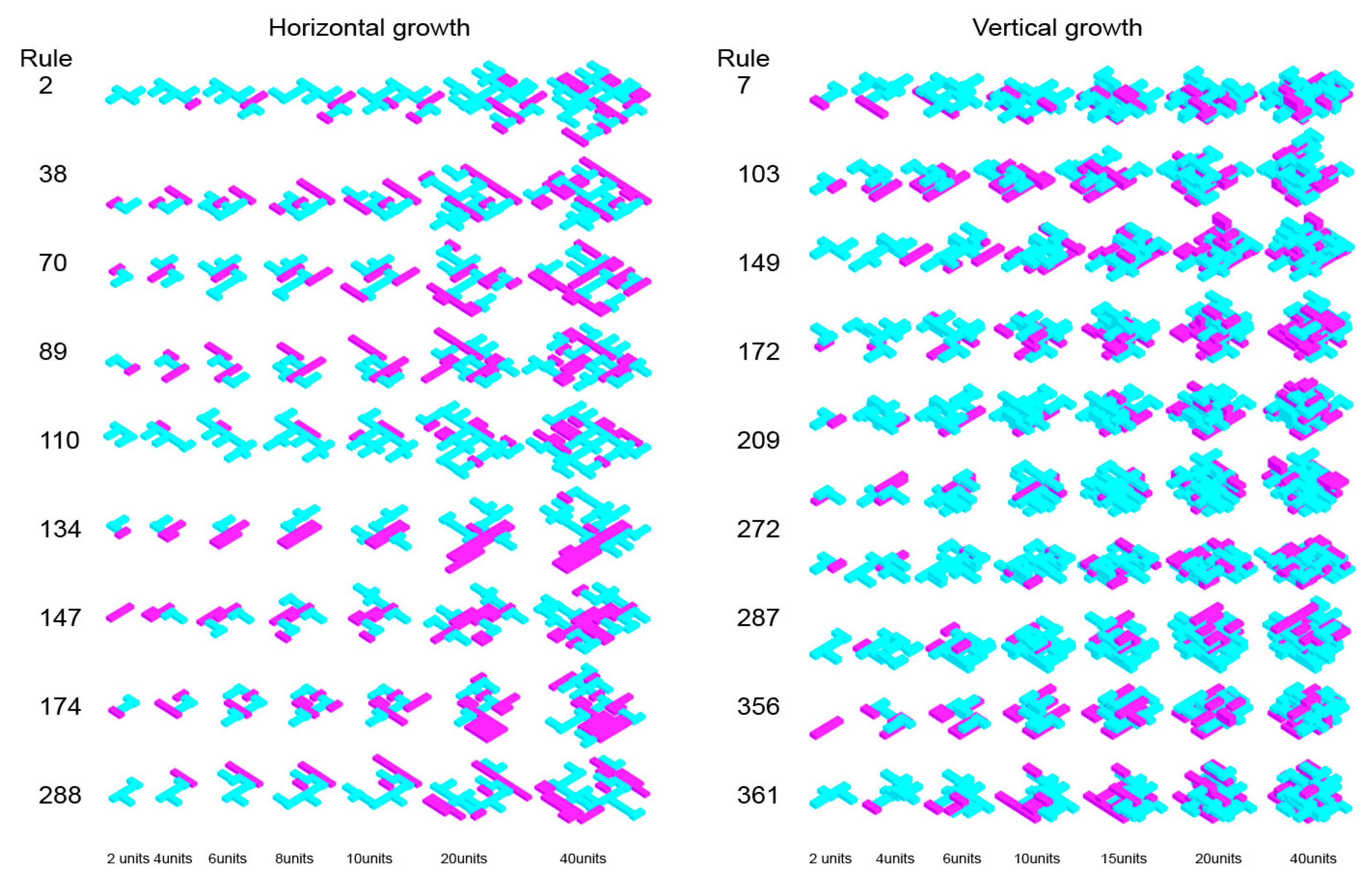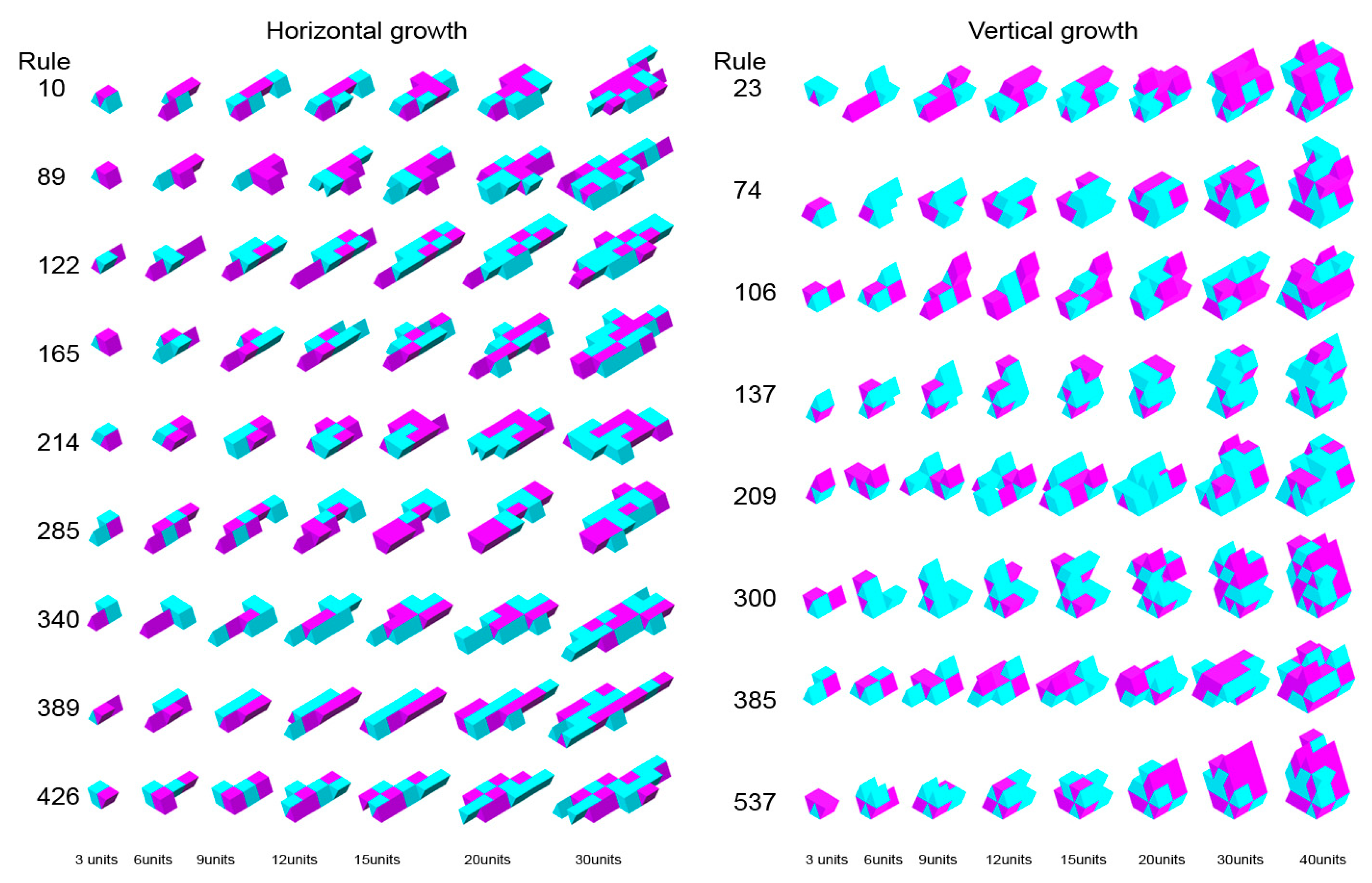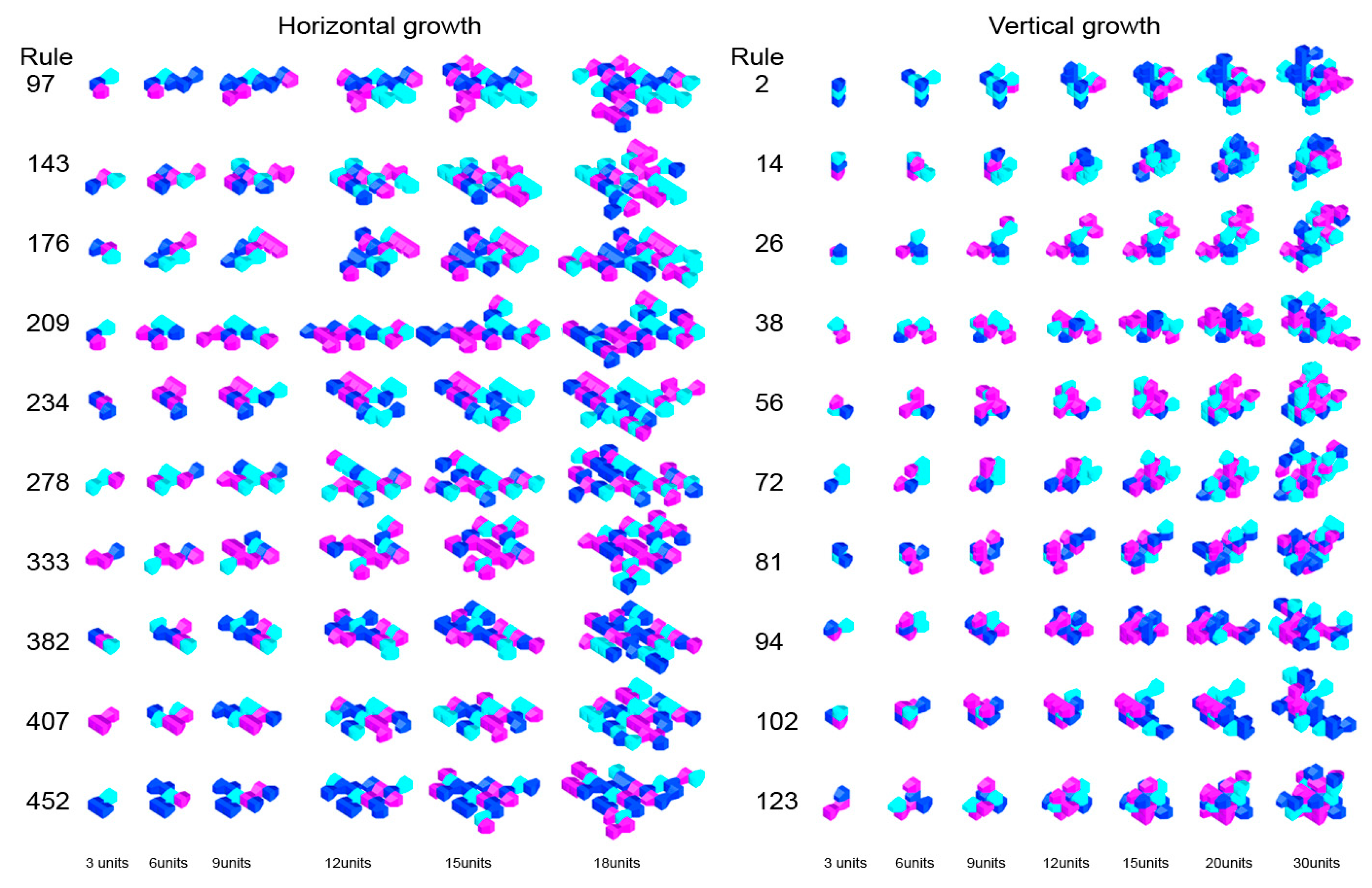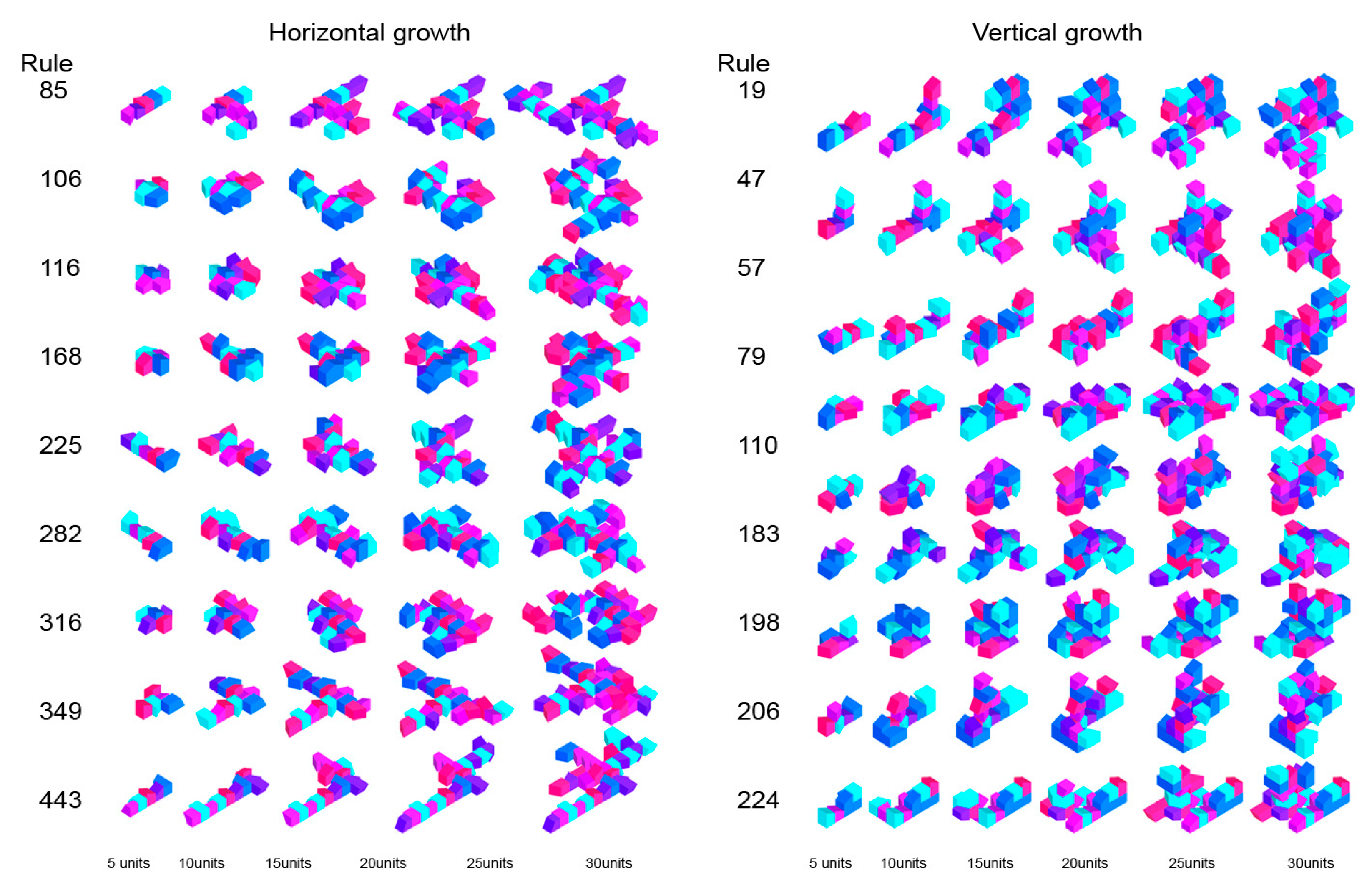 Figure 1. For each case study, the following are defined: (i) one or more base modules; (ii) connection points and planes between faces; (iii) horizontal and vertical bounding boxes governing growth; and (iv) iteration parameters and the number of units added.