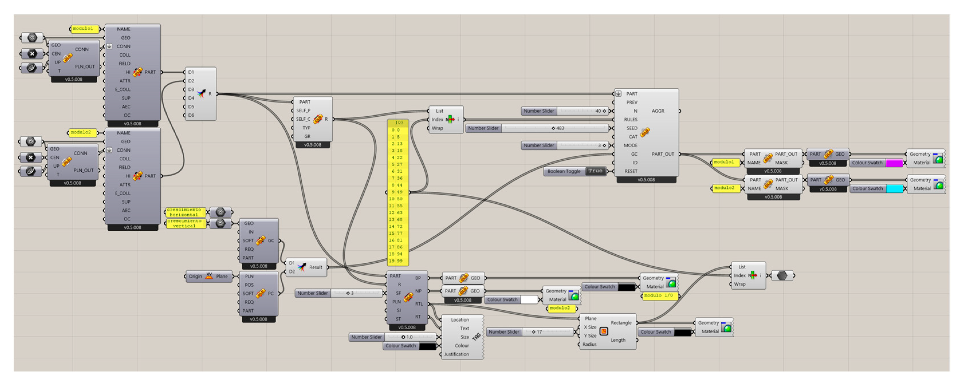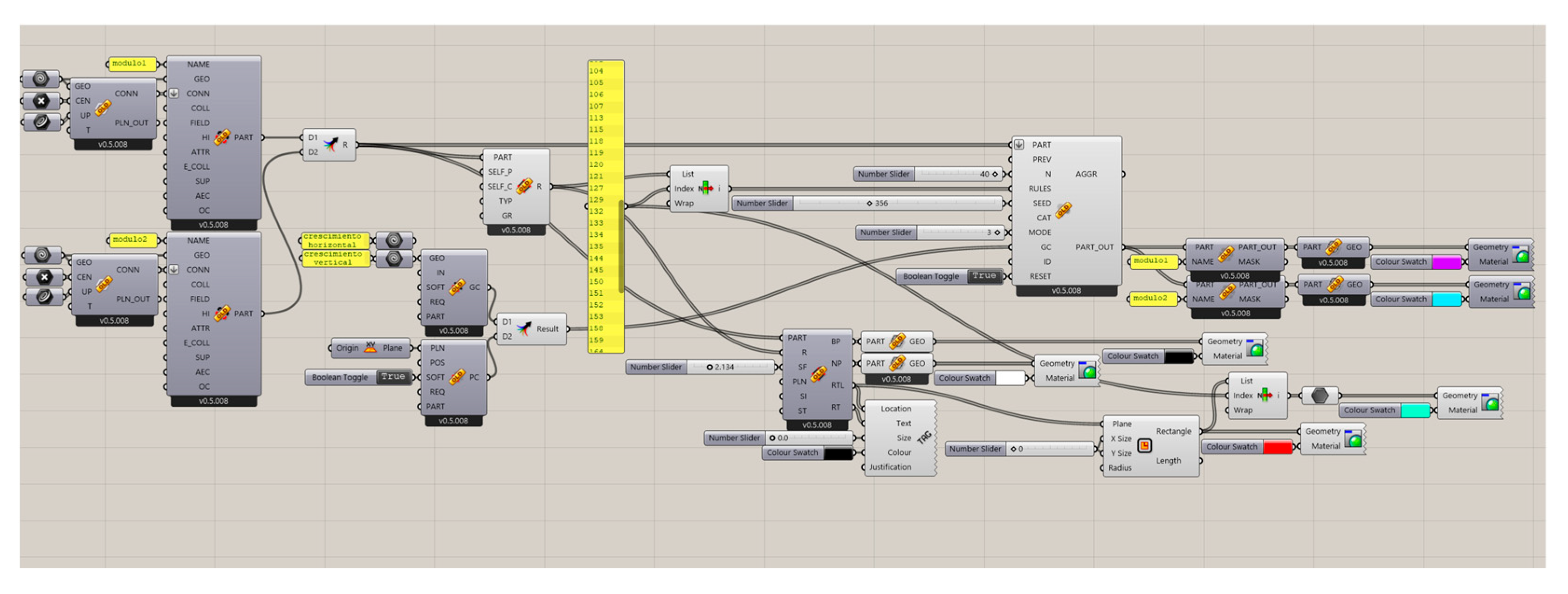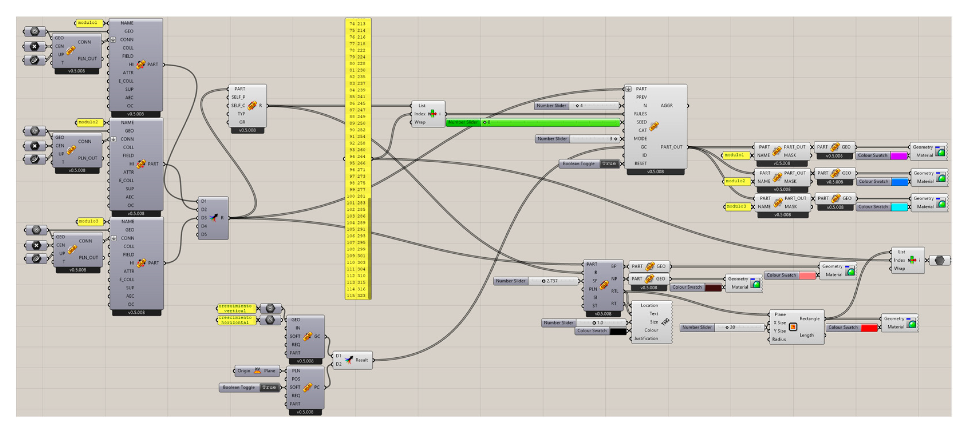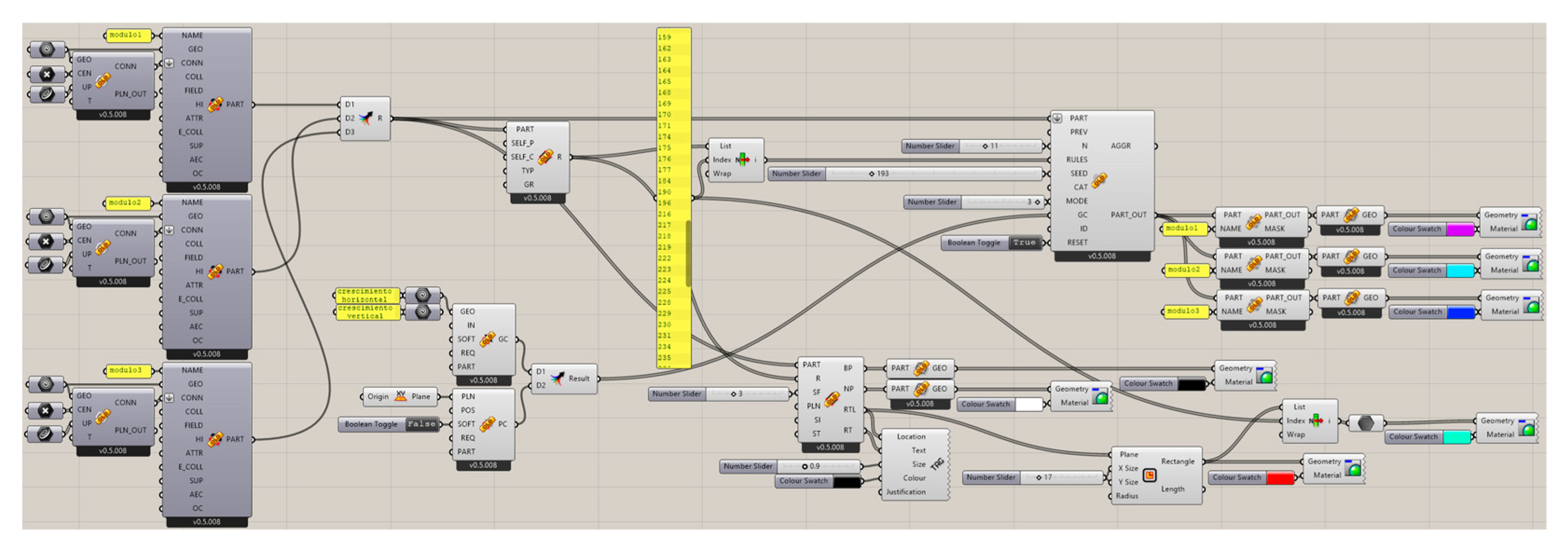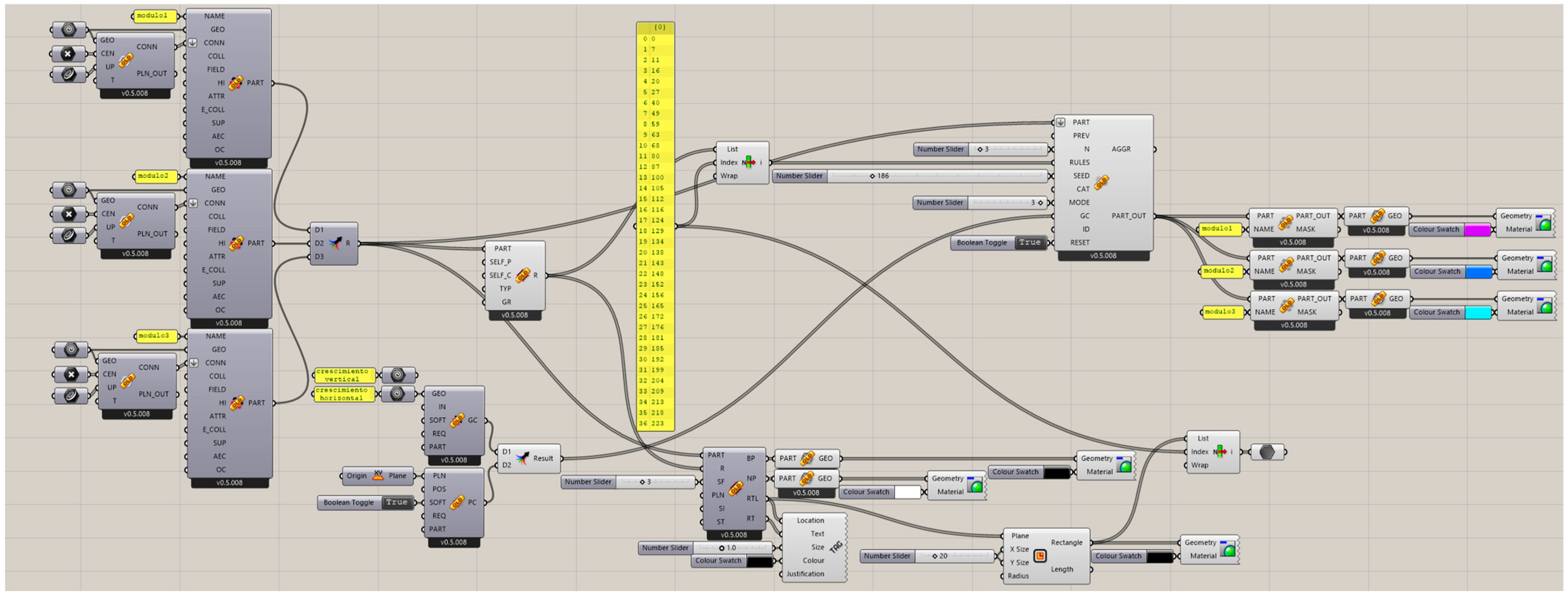 WASP is integrated into this framework by providing a dedicated set of components for discrete design. In each case study, analogous commands are used: geometry referencing, part definition, specification of connection points and directions, configuration of aggregation rules, and the execution of simulations with different set sizes (number of modules). This unified workflow enables behavioural comparisons without altering the overall methodological approach.