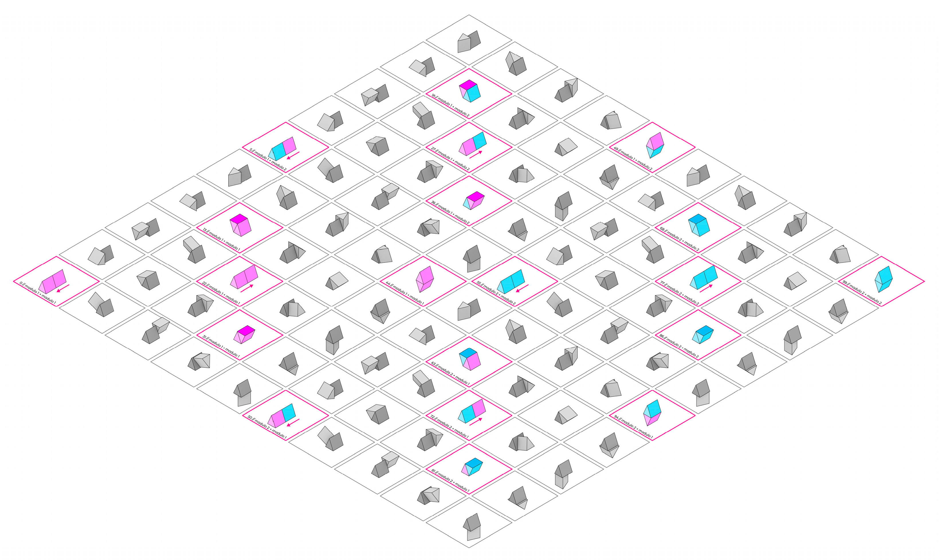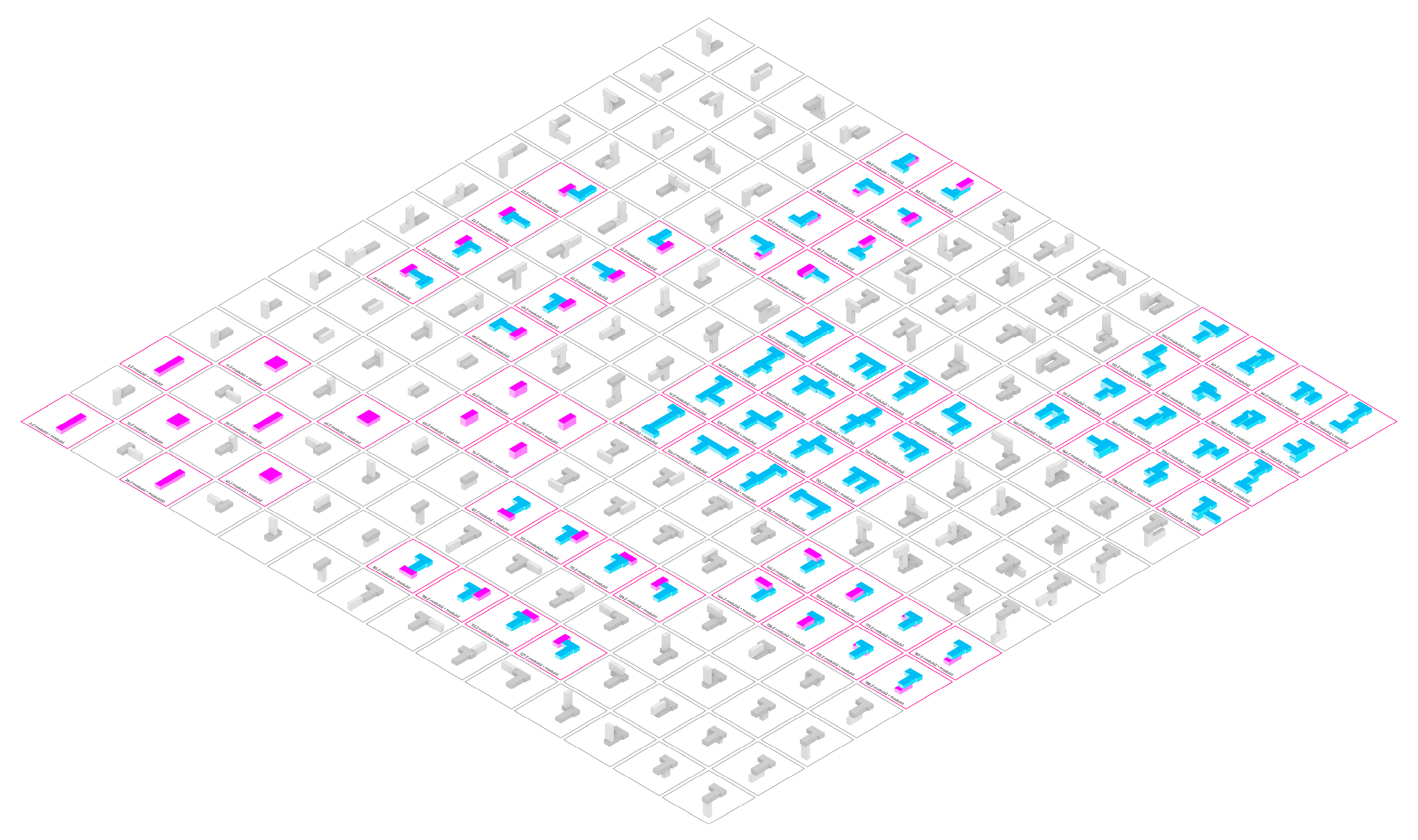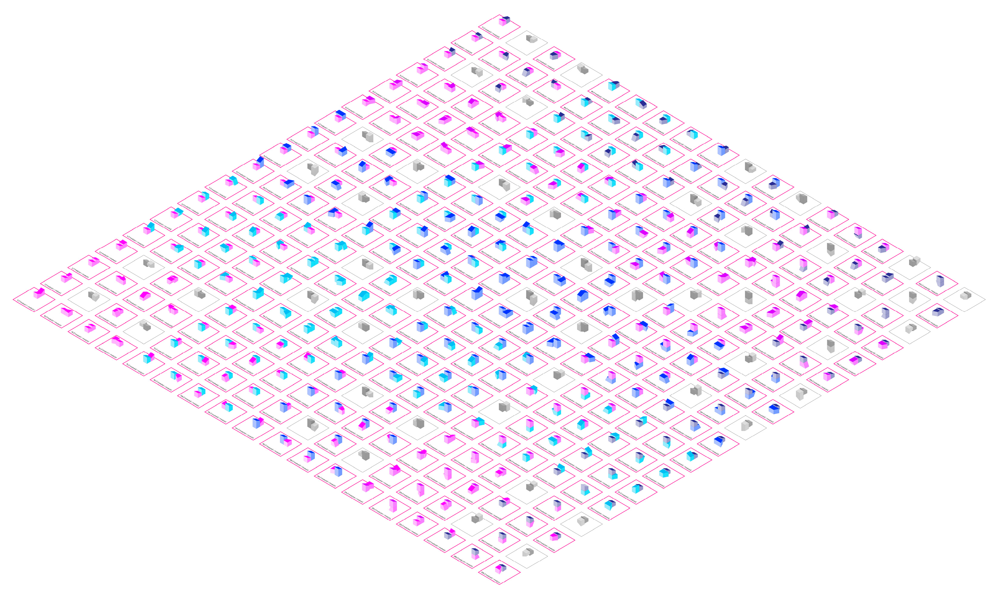 Finally, the results are analysed in terms of typological variability, spatial flexibility, and geometric feasibility. Common patterns and significant differences are identified between orthogonal and non-orthogonal systems, as well as between programmatically defined modules and formally open modules.