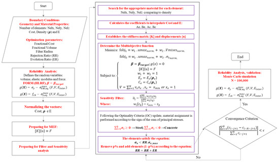 The study advances beyond the mere combination of existing techniques by proposing an integrated SESO-based algorithm with structural modifications that enable the simultaneous treatment of multi-material topology optimization, multi-objective formulation and probabilistic constraints directly within the evolutionary process. Furthermore, the calibration of material strength parameters, including the yield stress of steel and the compressive strength of concrete, , allowed the determination of the minimum resistance levels required to achieve the target reliability index β = 3.0, reinforcing both the methodological contribution and the practical engineering relevance of the proposed framework.