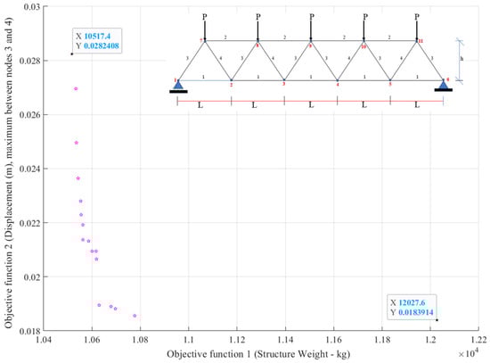 Figure 2 shows the Pareto frontier obtained from the parametric optimization of a truss structure with 19 bars. The design variations considered were the external diameters and thicknesses of the bars, aiming to minimize the structural weight and maximum displacement. The truss has a length m and a height m, with the following material properties imposed: modulus of elasticity of 210,000 MPa, yield strength MPa, density of 7850 kg/m3, and ultimate tensile strength of 510 MPa. The applied loads are N, participating in nodes 7, 8, 9, 10, and 11. All nodes are highlighted in red in the figure. Note that the objective functions are mutually conflicting [10].