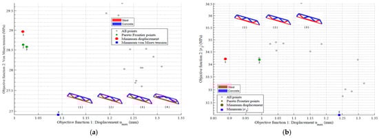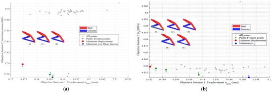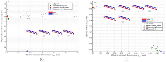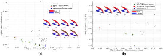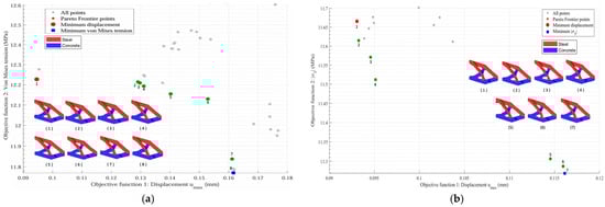 By clearly outlining the trade-offs between conflicting objectives, the Pareto frontier provides relevant information for the decision-making process in engineering design. This approach has been widely adopted in recent multi-objective optimization studies, such as those by Xu et al. [30], Yin et al. [31], and Crescenti et al. [32]. Thus, the multi-objective problems addressed in this work also resulted in their respective Pareto frontiers, as presented later in the numerical examples.