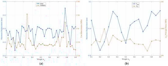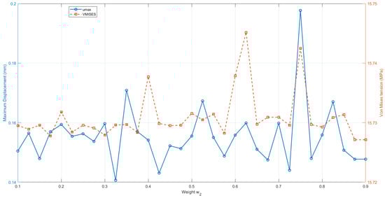 The graphs shown in Figure 19, Figure 20 and Figure 21 highlight the trade-off between displacement and von Mises stress or minimum principal stress as a function of weight . When this weight increases, prioritizing maximum displacement, a reduction in or stabilization of the maximum displacement () is observed, while the von Mises stress or minimum principal stress tends to increase or lose efficiency, and vice versa. This opposing behavior between the structural responses indicates that the improvement of one criterion generally occurs at the expense of the degradation of the other. The non-monotonic oscillations reinforce that there is no solution that simultaneously minimizes both functions, characterizing a typical trade-off in multi-objective problems. Therefore, the results confirm that maximum displacement and von Mises stress or minimum principal stress are conflicting objectives for the problem analyzed.