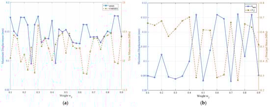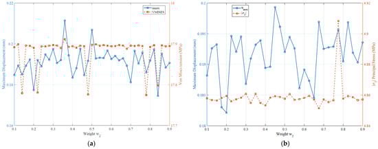 Figure 10 presents the results obtained for the case with reliability, considering the maximum von Mises stress fixed or minimum principal stress and equal to that from the deterministic model, (). It is noted that the introduction of reliability analysis modifies the sensitivity of the structural responses in relation to the weight , but preserves the general tendency for conflict between displacement and stress. For smaller values of , solutions with lower predominate, associated with higher levels of (), while an increase in leads to a reduction in stresses, accompanied by an increase in the maximum displacement. This behavior indicates that, even under reliability constraints, the improvement of one structural criterion necessarily implies the deterioration of the other, reinforcing the multi-objective nature of the problem.