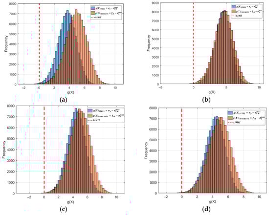 Next, after defining the samples according to the type of probability distribution, the probability of failure is then determined by the ratio between the number of simulations in which the limit state function is violated, g(x) ≤ 0, and the total number of simulations performed, as shown in Equation (14) [38].