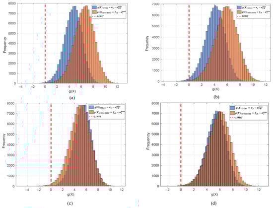 Monte Carlo simulation histogram of the center-loaded cantilever beam. SESO-FORM (): (a) Von Mises minimum stress point () and (b) minimum displacement point (); (c) minimum stress point (0.750) and (d) minimum displacement point (0.700).