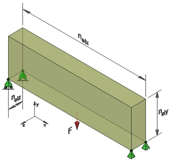 The optimized MBB beam consists of a simply supported beam, modeled with a first-order support (roller) at one end and a second-order support (pin) at the opposite end. The design domain was discretized with , and dm. A specific load of F = 100 kN was applied in the middle of the span, on the lower face of the beam, as illustrated in Figure 24. The optimization parameters were defined with a prescribed volume fraction of , cost of = 0.383 and a filter radius .