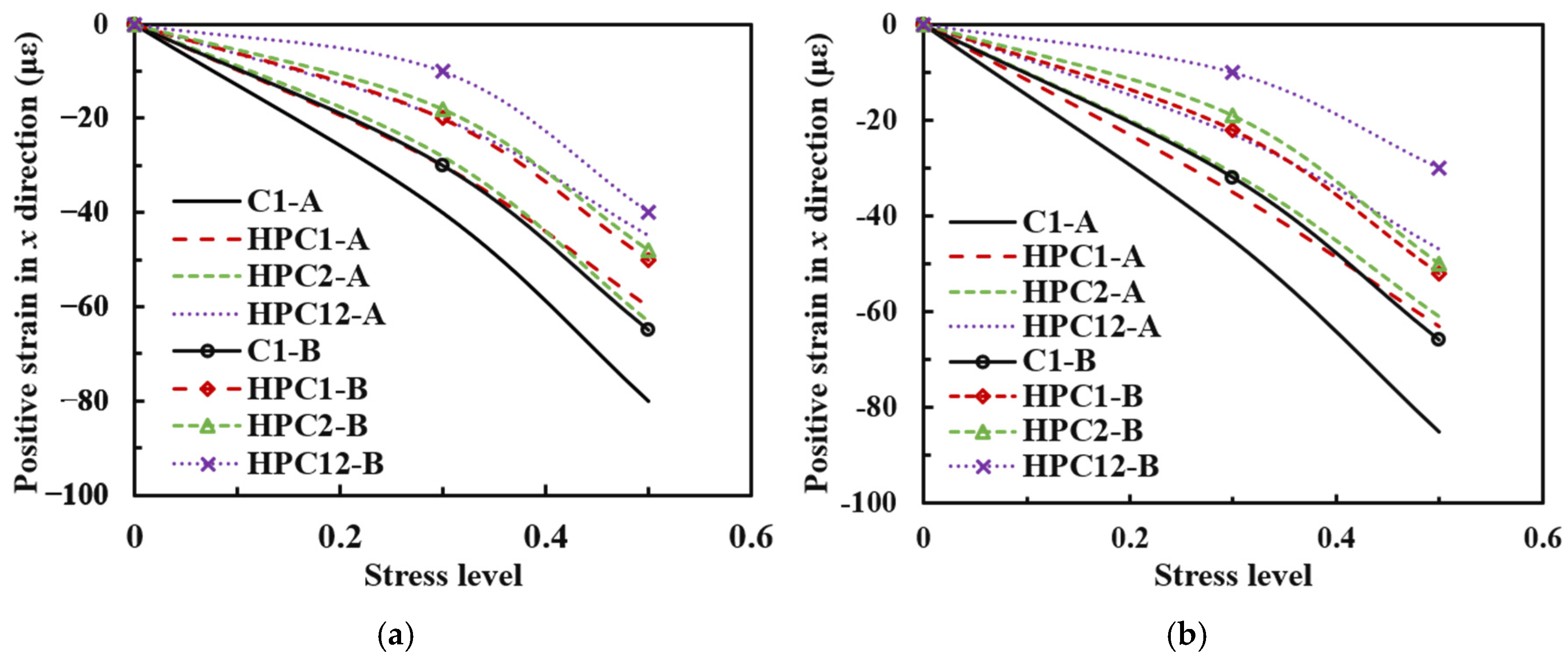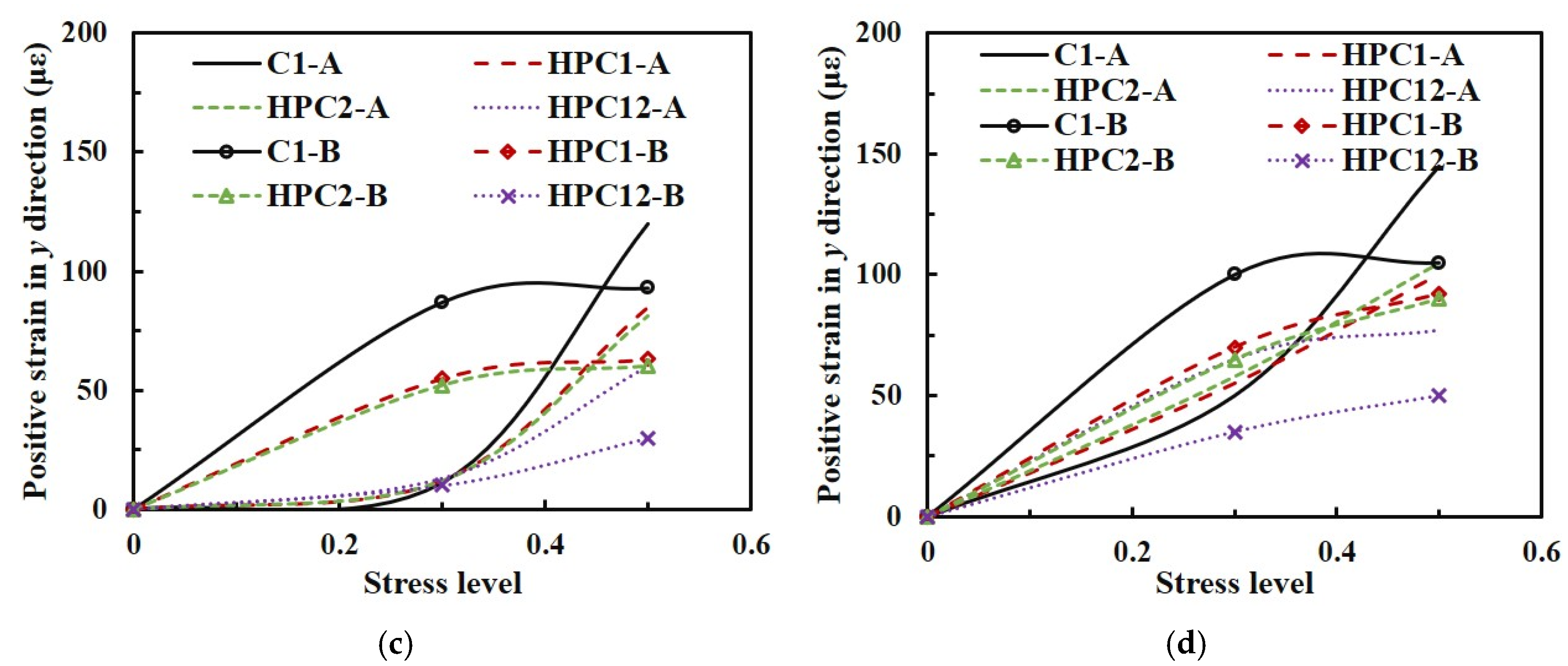 - In the longitudinal direction, the normal strain at the midspan gauge was approximately 20% higher than that at the other gauges, and chloride exposure had a negligible influence on the compressive strain measured along the longitudinal direction. In the lateral direction, the tensile strains at all measurement points increased with increasing compressive stress. The strain differences between the high-performance concrete containing fly ash alone and that containing silica fume alone were small in both the longitudinal and lateral directions. In both directions, the normal concrete specimens exhibited the largest strains, followed by the single-admixture high-performance concretes with fly ash or silica fume, whereas the binary-blended high-performance concrete incorporating fly ash and silica fume exhibited the smallest strains.