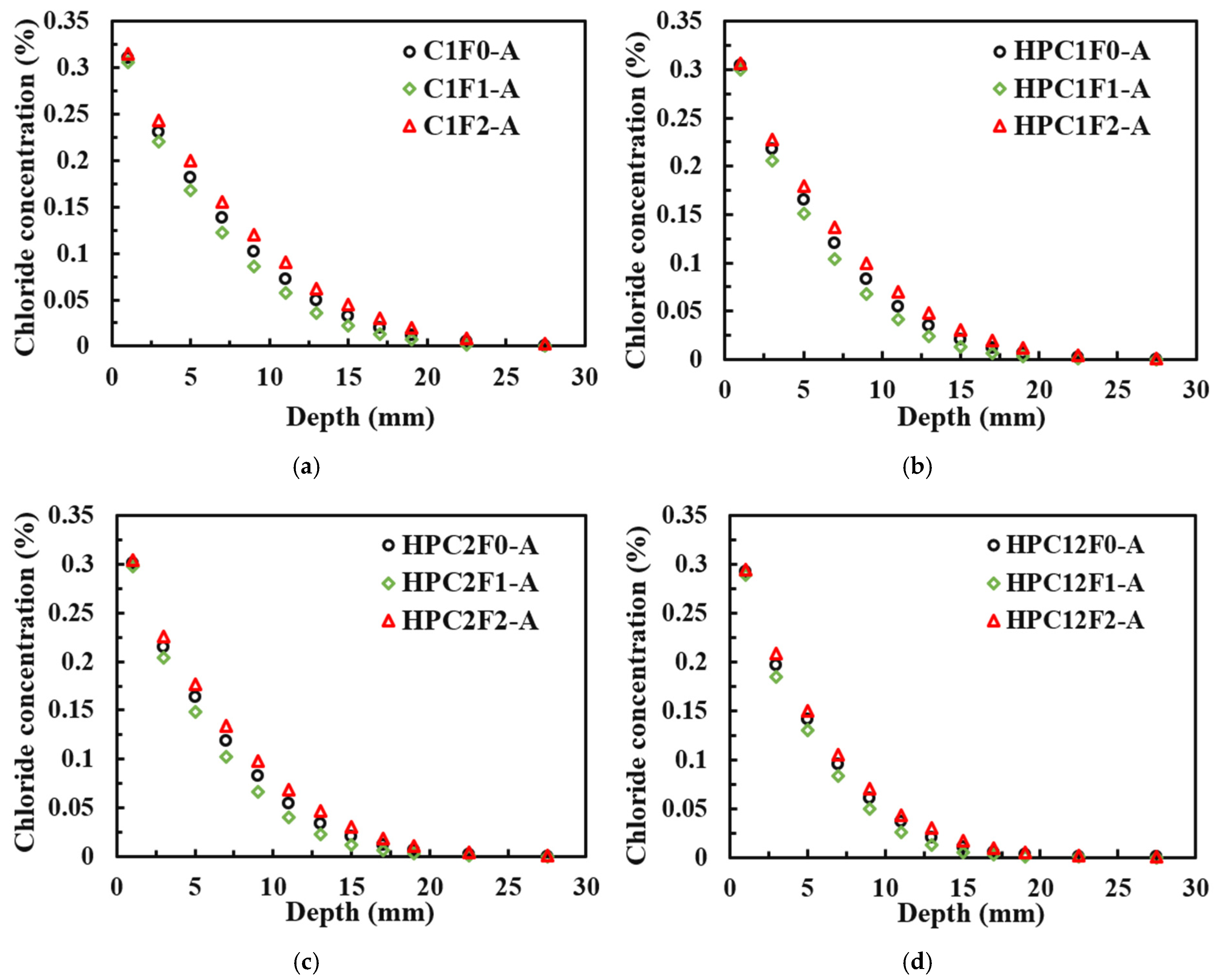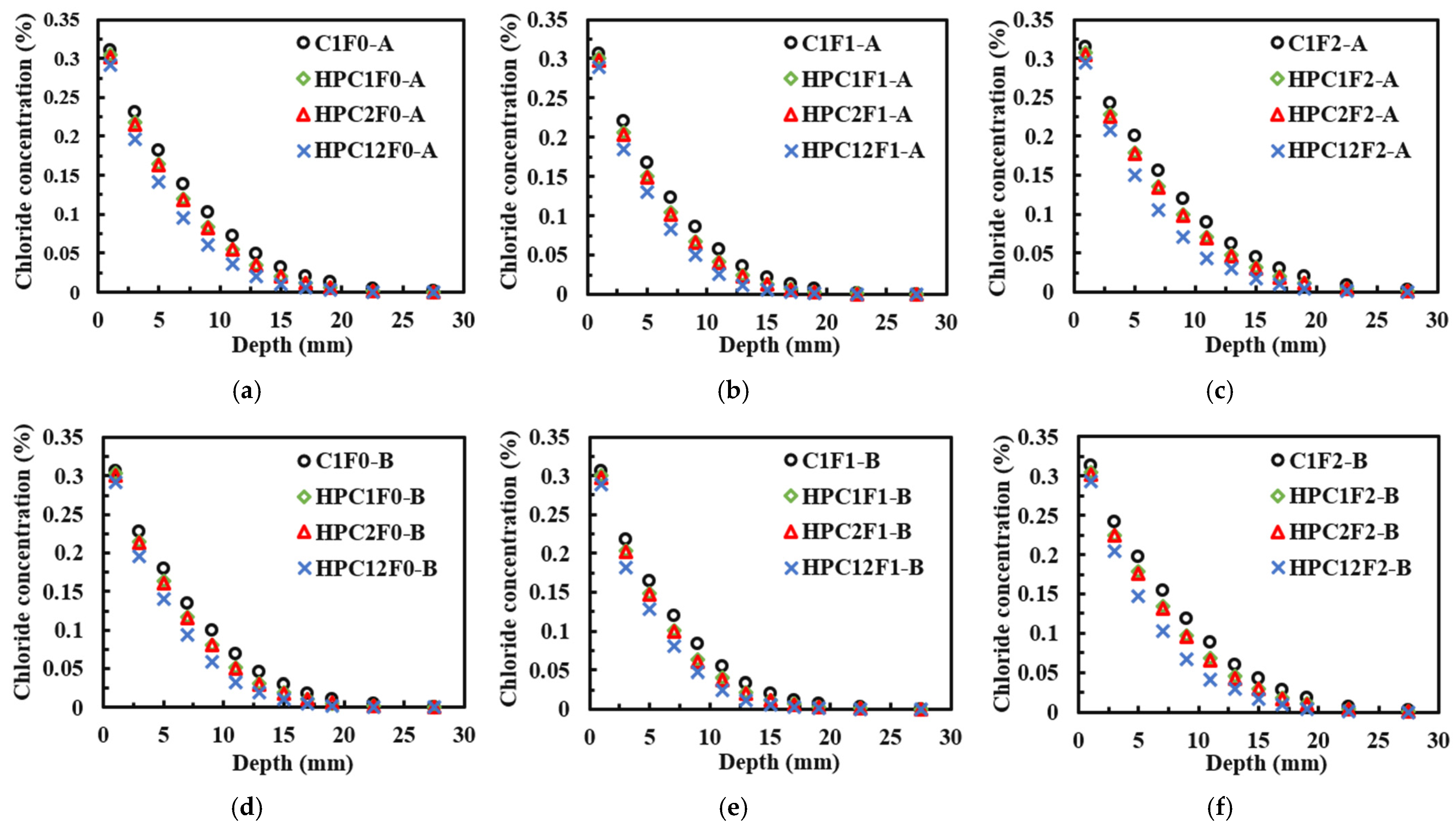 - The chloride ion diffusion rate of ordinary concrete specimens was the fastest. The chloride diffusion rate of high-performance concrete specimens with the single admixture of fly ash or silica fume was slower, and the difference in chloride concentration between the two was small. The chloride ion diffusion rate of high-performance concrete specimens with double admixtures of fly ash and silica fume was the slowest. The chloride concentration in concrete first decreased and then increased with the increase in the compressive stress level. The largest change amplitude was observed in ordinary concrete, and the smallest was in high-performance concrete with double admixtures of fly ash and silica fume.