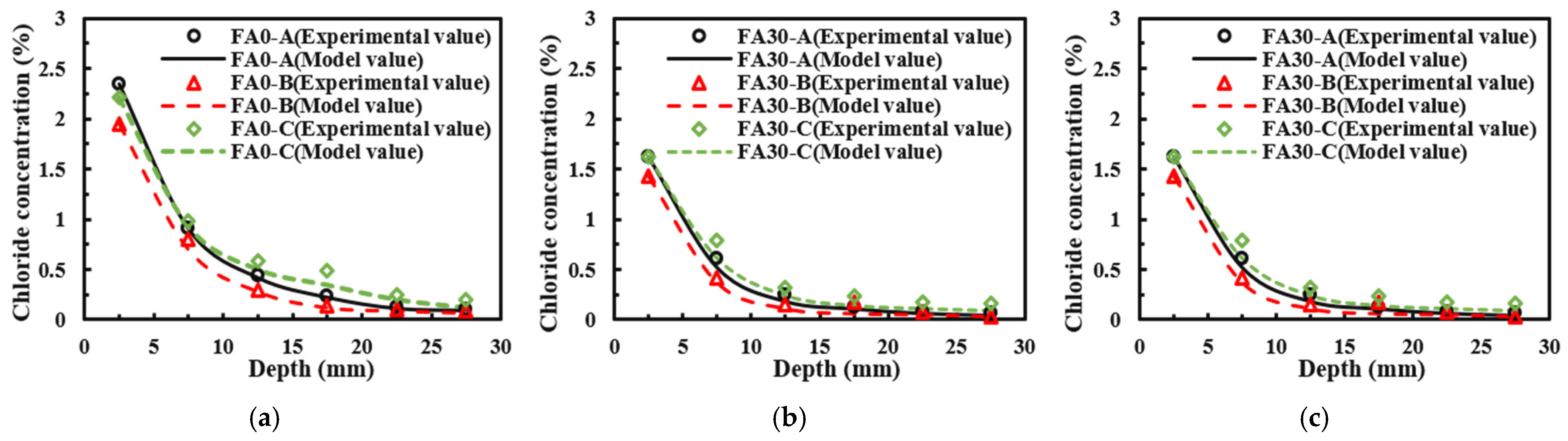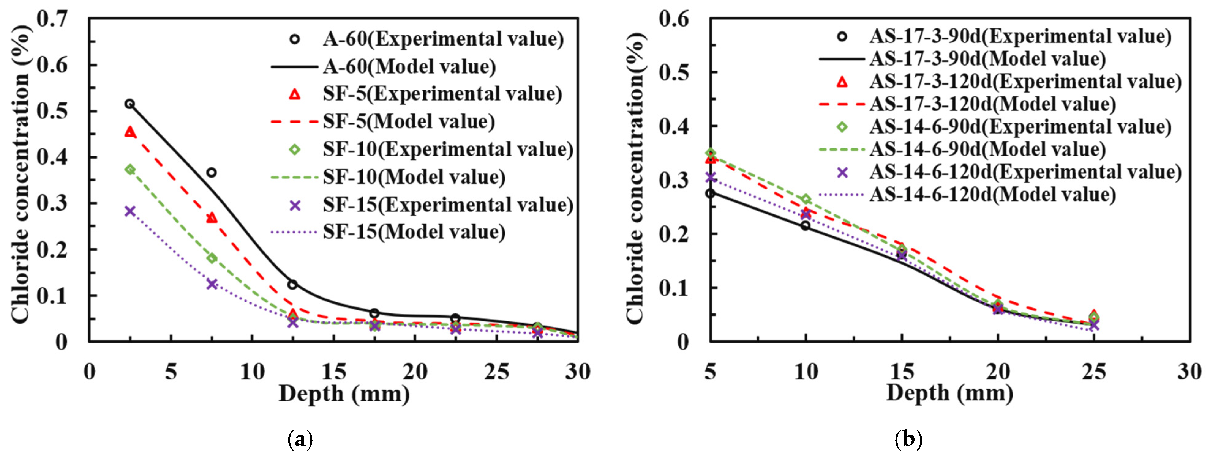 - An increase in the time decay coefficient caused the chloride concentration in binary-blended high-performance concrete to decrease first and then increase. When the fly ash content was kept constant, the chloride concentration gradually decreased with increasing silica fume content. When the silica fume content reached 17%, the chloride concentration at a diffusion depth of 11 mm approached zero. When the compressive stress level increased from 0.5 to 0.7, the chloride concentration increased by an average of 10.5%.