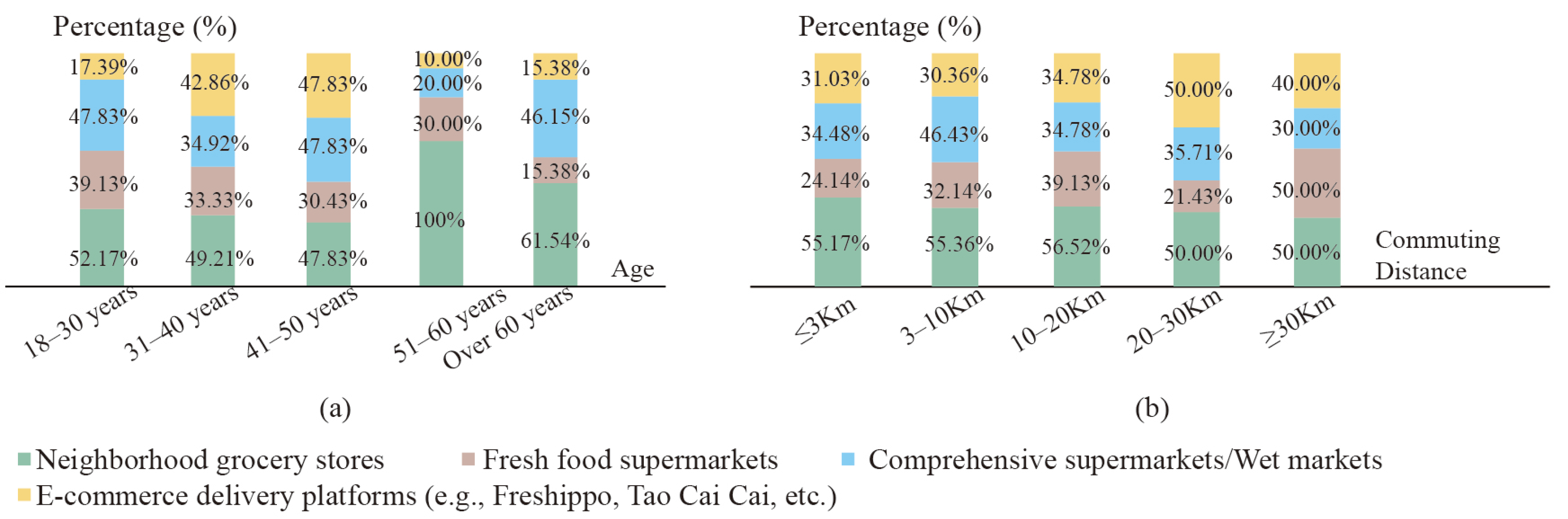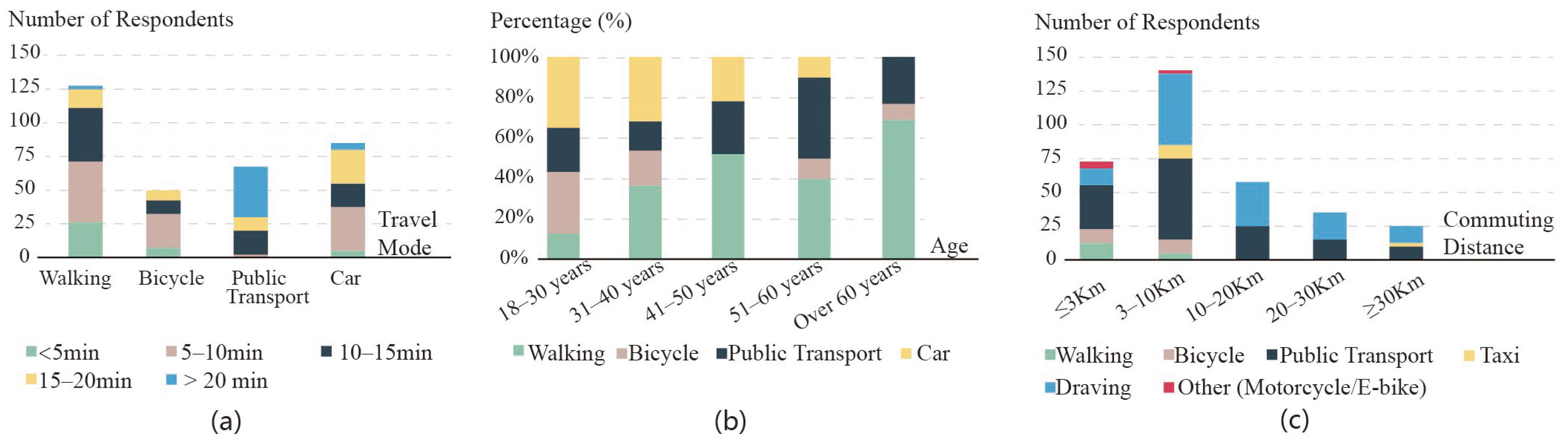 - Long-distance commuting patterns reinforce the spatio-temporal constraints under the separation of workplace and residence (Figure 3c). The surveys show that 71.97% of residents have a commuting distance exceeding 3 km, with 35.61% commuting more than 10 km. The commuting modes are dominated by public transport (43.18%) and private cars (39.39%). This long-distance and time-consuming commuting mode forces residents to adopt time-compensation strategies, reducing the time spent on physical procurement and instead relying on online consumption and delivery services [55].