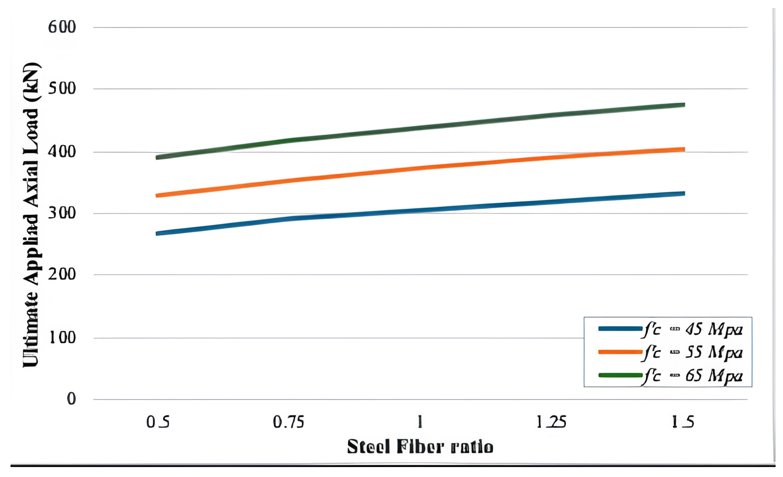 - The presence of 1.25% steel fibers led to an increase of up to 24% in the ultimate load capacity compared to the column without fibers, while the midspan deflection was reduced by approximately 54%. Increasing the concrete strength from 45 MPa to 65 MPa improved the load capacity by more than 44%, demonstrating the combined benefit of using high-strength concrete and optimal fiber content.