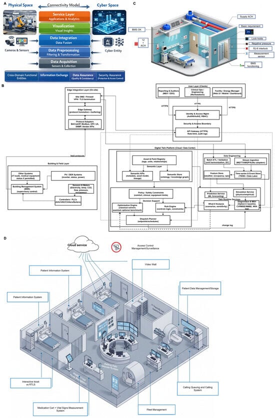 Option-C-verified semantic digital-twin architecture in CBD hospitals. (A) Physical–cyber connectivity stack showing how field sensing becomes operational action: data acquisition → preprocessing → integration → visualization → service and applications, with cross-cutting controls for information exchange, data quality and assurance, security, and auditability so pressure and energy decisions remain traceable from raw points to analytics outputs. (B) Semantic digital-twin layer that standardizes heterogeneous BAS and BMS and IoT data into a unified semantic store and APIs (points–equipment–space relationships), enabling portable workflows for prediction and simulation, what-if analysis, and optimization and AI services, and interfacing with the building network and BMS for orchestration and deployment. (C) Critical-room (AII) example illustrating supervisory control for directional airflow using ΔP sensing, door and flow interlocks, and alarm logic, alongside ventilation delivery checks (e.g., ACH status), aligned with a continuous negative-pressure intent (minimum −0.01 in. w.g. ≈ −2.5 Pa relative to adjacent areas). (D) CBD hospital deployment context showing how the semantic twin links sensing, data management, analytics, and user interfaces across clinical rooms and shared services to coordinate reliability and decarbonization at whole-facility scale under dense siting and constrained plant and shaft conditions.