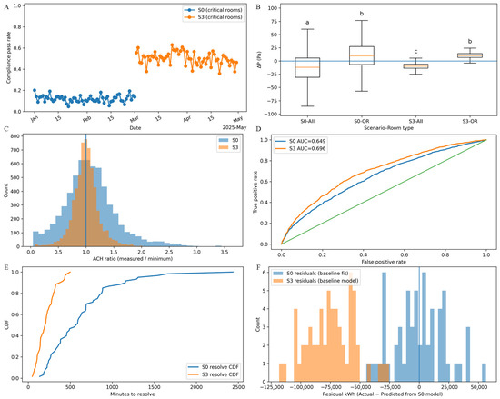Option-C outcomes of the smart-hospital intervention. (A) Weekly critical-room pressure-relationship compliance pass rate comparing baseline (S0) with intervention (S3), showing a discrete and sustained post-deployment uplift in compliance fraction. (B) Room-to-corridor differential pressure (ΔP, Pa) distributions by scenario and space type (AII and OR), demonstrating tighter control and reduced dispersion under S3; letters denote statistically distinguishable strata. Bars annotated with different letters (a, b, and c) indicate statistically significant pairwise differences between scenarios (p < 0.05), whereas bars sharing the same letter indicate no significant difference (p > 0.05). (C) ACH ratio (measured and minimum) histograms with unity reference, indicating that S3 concentrates operation nearer intent while reducing high-excess outliers (i.e., reliability without systematic over-ventilation). (D) Receiver operating characteristic (ROC) curves for operational-state classification (e.g., compliant vs. noncompliant), reporting improved discrimination under S3. The green diagonal line indicates the no-discrimination (random-classifier) reference (AUC = 0.5). (E) Minutes-to-resolve distribution (CDF) showing reduced long-tail resolution times under S3—an operational reliability and staff-burden outcome. (F) Whole-facility energy residuals (kWh; actual minus S0-calibrated baseline prediction) shifting negative in S3, consistent with Option-C whole-facility savings inference when normalized against baseline drivers.