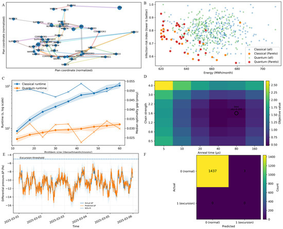 Operational planning and decision support were framed as a multi-objective optimization problem balancing energy (and carbon-relevant) performance against an infection-risk index and operational feasibility. Feasible frontiers were summarized using energy–risk trade plots and Pareto-efficient subsets, as reflected in the figures. To assess scalability and decision quality, we benchmarked multiple solver families aligned with the figure comparisons: heuristic (Greedy), metaheuristic (simulated annealing (SA), and genetic algorithm (GA)), and (mixed-integer linear programming; MILP). Optimization workflows were implemented in Python (Python Software Foundation, Beaverton, OR, USA) using Pyomo (Sandia National Laboratories, Albuquerque, NM, USA) for MILP formulation, solved with representative MIP solvers (Gurobi Optimizer; Gurobi Optimization, LLC, Beaverton, OR, USA; v11.x; IBM ILOG CPLEX Optimization Studio; IBM, Armonk, NY, USA; v22.1.1; and COIN-OR CBC; COIN-OR Foundation, Inc., Towson, ML, USA) with run logs and solver parameters archived; QA experiments used the D-Wave Ocean stack and minorminer embedding tooling (D-Wave Quantum Inc., Palo Alto, CA, USA; with corporate operations also in Burnaby, BC, Canada) and sweeps over chain_strength, num_reads, and annealing_time consistent with the reported stability analysis. In addition, we evaluated QA as an exploratory solver family to provide a forward-looking baseline for structurally similar problems under emerging hardware constraints; importantly, for the problem sizes studied here, MILP is sufficient and consistently achieved the best (or best-observed) results, and is therefore the recommended approach for current deployments. Solver performance was characterized along four axes consistent with the presented panels: (i) optimality gap relative to the best observed solution as problem size increases, (ii) runtime scaling (seconds; log scale) versus the number of departments and rooms, (iii) feasibility and constraint behavior via a flow-penalty proxy in the cost–carbon trade space, and (iv) downstream decision operability using a bounded safety index (0–1) for the top-K solutions with component contributions (e.g., movement burden, adverse-pressure penalty, compliance).