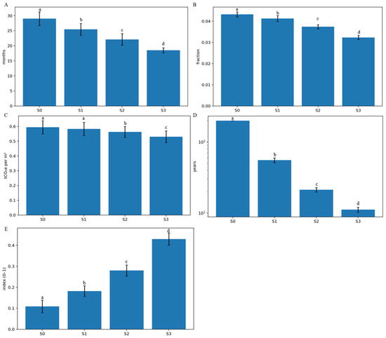 Scenario-wise deployment maturity effects on time-to-value, burden, and carbon intensity. (A) Scenario-stratified time metric (months; study-defined) showing monotonic reduction from S0→S3, consistent with shorter time-to-verified benefit under higher digital-twin maturity. (B) Scenario-stratified burden fraction (study-defined), decreasing across S0→S3, reflecting reduced time-in-state of undesired operational conditions under advanced governance. (C) Carbon-intensity outcome (tCO2e per m2; facility-normalized) decreasing across scenarios, aligning reliability gains with operational decarbonization. (D) Years-scale horizon metric (log scale; study-defined), compressing across S0→S3 to indicate reduction in long-tail exposure to adverse operational regimes. (E) Composite index score (0–1; bounded), increasing across S0→S3 as an integrated summary of reliability, carbon, and service burden performance; error bars denote variability and letters indicate statistically distinguishable scenario groups. Bars annotated with different letters (a, b, c, and d) indicate statistically significant pairwise differences between scenarios (p < 0.05), whereas bars sharing the same letter indicate no significant difference (p > 0.05).