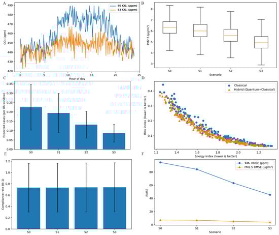 IAQ burden and health-risk proxy outcomes. (A) Diurnal CO2 profiles (ppm) comparing baseline (S0) with advanced intervention (S3), showing reduced daytime elevations consistent with improved ventilation and flow management. (B) PM2.5 distributions (µg m−3) by scenario (S0–S3), indicating progressive reduction in central tendency and spread. (C) Expected adverse-case burden (per 8 h window; model-based) decreasing from S0→S3, consistent with reduced exposure-driven risk under improved control. (D) Energy–risk trade space (normalized indices; lower values are better) comparing classical optimization with hybrid quantum + classical solutions, showing movement toward more favorable Pareto regions. (E) Aggregate compliance rate (0–1; study-defined indoor environmental quality (IEQ) and indoor air quality (IAQ) compliance construct) remaining stable across scenarios, indicating that burden reductions are not achieved by relaxing compliance criteria. (F) Prediction accuracy by scenario (RMSE for CO2 and PM2.5), improving across S0→S3, consistent with higher-fidelity monitoring that supports auditable operational governance.