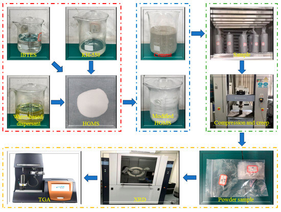 Based on previous experimental experience and the requirements of the construction industry for cement materials, the mix proportion employed a water–cement ratio fixed at 0.35, ensuring no decline in the structural strength of the final product and reducing potential adverse effects on hydration kinetics. For these ten formulations, twelve cylindrical samples were prepared for each formulation. Three samples from each formulation were selected for creep tests, three for uniaxial compression tests, and the remaining six were used for physical property measurements (density, porosity, water absorption) and hydration analysis (XRD and TGA). All reported values represent the average of three parallel samples, and the error bars indicate the standard deviation under applicable conditions. All the reported values represent the average of these repeated samples. The high-pressure-resistant lightweight cement composites were prepared following a systematic mixing procedure to ensure uniform dispersion of all components. First, a modification solution was prepared by combining KH-550 silane coupling agent (2.0% by weight of HGMS), water-based dispersant AD-8057 (2% of total material weight), and anhydrous ethanol in a 95:5 ethanol-to-water ratio. The required mass of HGMS (as specified in Table 3) was added to this solution and manually agitated for 10–15 min until the microspheres reached a cotton-like state with no visible dry powder. IBTES (20 g, 4% by weight of cement) was then added and stirred for an additional 5 min. The modified HGMS were dried at 120 °C for 16 h, cooled, and sieved through a 100-mesh Taylor sieve. For specimen preparation, 500 g of Portland cement and the dried modified HGMS were dry-mixed in a planetary mortar mixer at 140 rpm for 2 min. Tap water (175 g) was gradually added, and mixing continued at 285 rpm for 3 min to form a homogeneous paste. The fresh mixture was cast into cylindrical molds (50 mm × 100 mm), vibrated for 60 s, and covered with plastic film. All specimens were cured at 20 ± 2 °C and ≥95% relative humidity for 24 h, then demolded and returned to the curing chamber for an additional 28 days before testing. The overall procedure is illustrated in Figure 1.