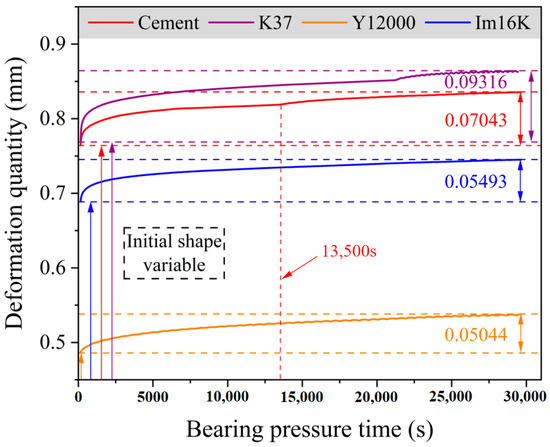 The average creep rate of the four materials at this stage can be calculated, namely for pure cement material: 2.348 × 10−6 mm/s, K37: 3.105 × 10−6 mm/s, Im16K: 1.831 × 10−6 mm/s, Y12000: 1.681 × 10−6 mm/s, The smaller the average rate of steady-state creep, the better the creep performance of the material, and it can withstand greater stress and have a longer service life [26]. By comparison, it can be seen that adding particles of smaller size of HGMS makes the high-pressure resistant lightweight cement composite material have a better high-pressure resistance than pure cement material. The main reason lies in the changes in the internal structure and composition of the material. HGMS has a high strength and, after the action of IBTES, forms a better bonding effect with the cement aggregate, enhancing the bearing capacity of the cement material and further improving the creep performance.