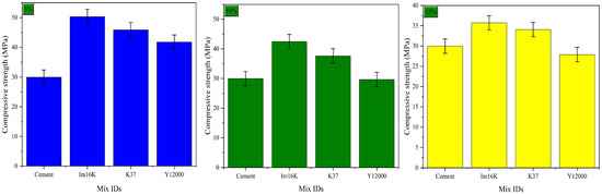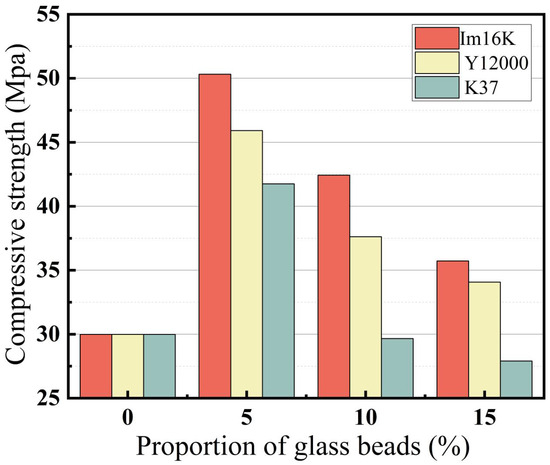 For a clearer comparison of how HGMS size influences cement performance, Figure 6 plots the peak stress achieved at equal dosages but varying particle diameters. Test results indicate that all dosage levels exhibit comparable trends: the compressive strength of the cement declines as the HGMS size increases—a behavior potentially linked to particle agglomeration—though overall strength remains higher than that of unmodified cement. By evaluating the peak stress across different addition rates, the optimal formulation was identified as 5% content of Im16K-type HGMS with a particle size of 25 μm. This optimum group attained a peak stress of 50.32 MPa, representing a 67.85% increase over plain cement.