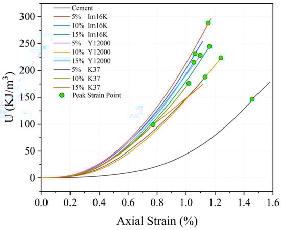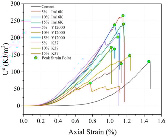 Among them, σ represents axial stress, ε represents axial strain, Eu represents the elastic modulus of the cement specimen, and E is the initial elastic modulus of the specimen, which is determined separately for each sample. Its value is the tangent modulus at 40% of the peak stress, ensuring an accurate reflection of the unique stiffness characteristics of each mixture. Since the unloading process was not involved in this experiment, Eu can be replaced by E [29].