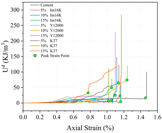 Figure 10 presents the evolution of dissipation energy (U_d) for the tested specimens, which can be categorized into three distinct phases. Initially, the dissipation energy for all specimens remains near zero, exhibiting a slow growth rate. This is followed by a second phase characterized by a fluctuating yet rising trend in U_d. Finally, a stage of rapid increase is observed. In contrast to the modified cement composite, the curve for the control group is comparatively smoother, lacks a clearly defined second phase, and enters the stage of rapid energy dissipation at an earlier point. This indicates that the unmodified material undergoes instantaneous failure at the peak stress, reflecting higher brittleness. On the contrary, the cement materials with HGMS and IBTES added show a clear second stage, indicating that the material begins to generate damage partially before the peak stress point and completes the final damage at that point. The material has better high-pressure resistance capability.