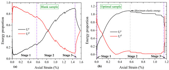 The energy distribution evolution during uniaxial compression was further compared between the control group and the optimal composite. Figure 11 illustrates the proportional variation in elastic energy (Ue) and dissipated energy (Ud) with strain for both groups. The energy evolution exhibits clear stage-wise characteristics, broadly divisible into three phases: an initial energy accumulation stage (Phase I), an accelerated energy accumulation stage (Phase II), and a rapid energy dissipation stage (Phase III).