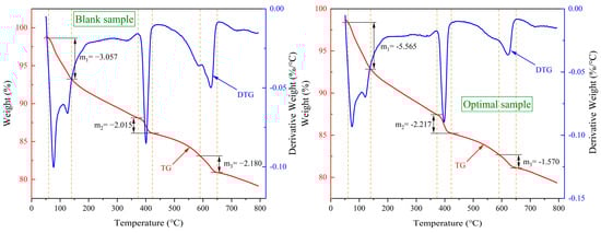 The hydration performance of the composite was further assessed via TGA, as depicted in Figure 13. Owing to distinct water-binding mechanisms in different minerals, their dehydration occurs at specific temperature ranges. In the tested samples, the DTG curves revealed three well-defined peaks during heating. The first (60–140 °C) corresponds to the loss of crystalline water from hydration products, including AFt and C-S-H gel. The second (370–430 °C) is attributed to the decomposition of Ca(OH)2, and the third (590–650 °C) to the breakdown of triclinic CaCO3. The weight loss curve shows that the weight loss rate from room temperature to 150 °C is greater than that from 150 °C to 800 °C. From the mass change in the figure and the heat decomposition formula of Ca(OH)2: