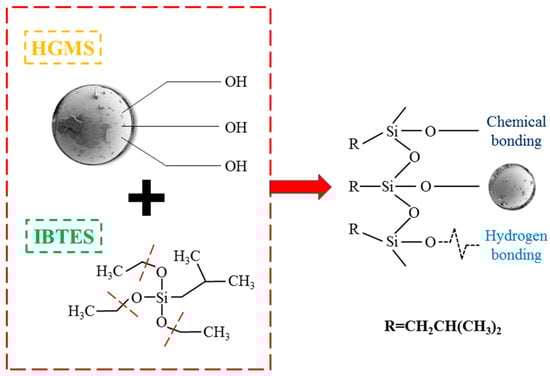 To enhance the interfacial bonding force between HGMS and the cement matrix, IBTES was used as a surface modifier. Choosing IBTES is due to its dual-functional molecular structure: the triethoxy group will hydrolyze and form covalent siloxane bonds with the silanol groups on the surface of HGMS, while the isobutyl group will interact with the cement in the process of hydration. This chemical connection effect promotes interfacial adhesion, reduces microcracks, and helps form a denser microstructure. Based on the optimization experiments, the addition amount of IBTES was 4% of the cement weight to ensure complete coverage of the surface and avoid excessive silane, which could interfere with the hydration process.