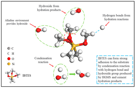 As shown in Figure 14, when IBTES is added to the modified solution and reacts with the partially active SiO2 on the surface of HGMS, through the dehydroxylation of the surface partial hydroxyl groups, the C-O bonds on the surface of HGMS are broken and connected with the polar groups of IBTES. This plays the role of an interface adhesive on the surface of HGMS [31]. Upon contact with water, cement clinker undergoes a hydration process accompanied by heat release. As outlined in Equations (7) and (8), calcium hydroxide (Ca(OH)2) is formed during this reaction. In the newly developed composite, the Ca(OH)2 produced can subsequently react with the IBTES coating on the surface of the HGMS. This interaction generates water via a condensation reaction, which in turn accelerates the decomposition of C3S and facilitates the formation of calcium aluminosilicate phases. Concurrently, a portion of the Ca(OH)2 is consumed to produce C-S-H, thereby enhancing the interfacial adhesion between the cement matrix and the HGMS fillers.