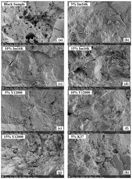 As shown in Figure 16, the control group has a relatively loose microstructure, with visible microcracks and loosely arranged hydration products (Figure 16a). The optimal formulation shows good dispersion of microspheres, closely embedded in the cement matrix, with a dense and continuous interface transition zone, and no obvious voids, indicating a strong bonding force (Figure 16b). Smaller HGMS particles were observed to effectively fill the voids between cement particles, contributing to the densification of the matrix (Figure 16b–d). In contrast, larger HGMS occasionally showed poor bonding force or local aggregation at higher doses, which was related to the decline in mechanical properties (Figure 16g,j). At a 5% dosage, HGMS was uniformly dispersed and closely combined. However, at a 15% dosage, agglomeration occurred, and microcracks were easily generated around the microsphere clusters, which explains the increased porosity and decreased strength observed in physical and mechanical tests. These microscopic photos provide direct and specific evidence for the formulation, indicating that the combined treatment of HGMS and IBTES can form a denser microstructure, reduce microcracks, and enhance interfacial adhesion. Systematic scanning electron microscope analysis of all ten groups confirmed that at a finer particle dosage of 5%, the best microstructure could be achieved, namely, uniform dispersion of HGMS, minimal agglomeration, and dense ITZ, which validates the improved creep resistance, higher compressive strength, and more stable energy evolution reported in Section 3.1, Section 3.2 and Section 3.3.