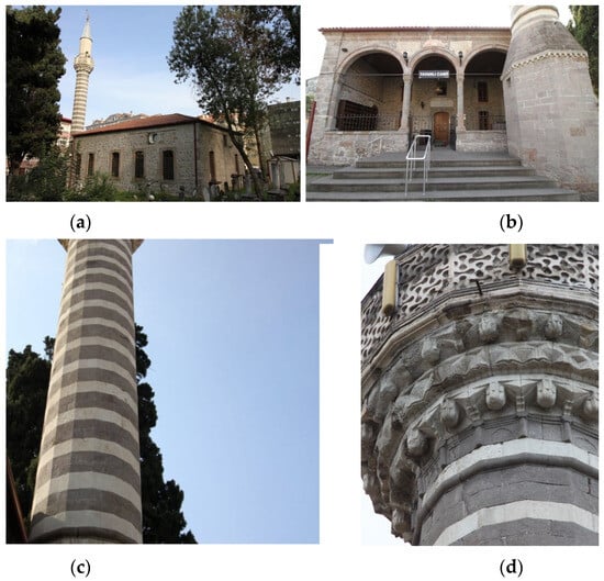 (a) The Tavanlı Mosque and (b–d) different side views of the mosque’s minaret.