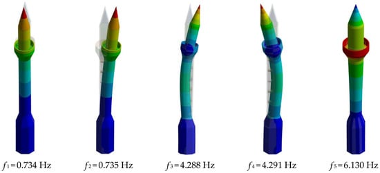 The first five frequencies of the minaret’s initial FE model were obtained within the range of 0.734–6.130 Hz as illustrated in Figure 6. The modal analysis results indicated that the first two modes corresponded to fundamental bending in horizontal directions. The third and fourth modes represented higher-order flexural modes. The fifth mode was identified as a torsional mode. The modal analysis included the thirty modes in order to ensure adequate representation of the dynamic characteristics of the minaret, achieving approximately 95% mass participation ratio. However, since the first five modes dominated the structural response and adequately described the fundamental dynamic behavior, only these modes (corresponding to about 47% mass participation ratio) were reported herein. Figure 6 showed the first five mode shapes and their corresponding frequencies of the minaret.